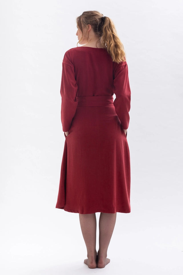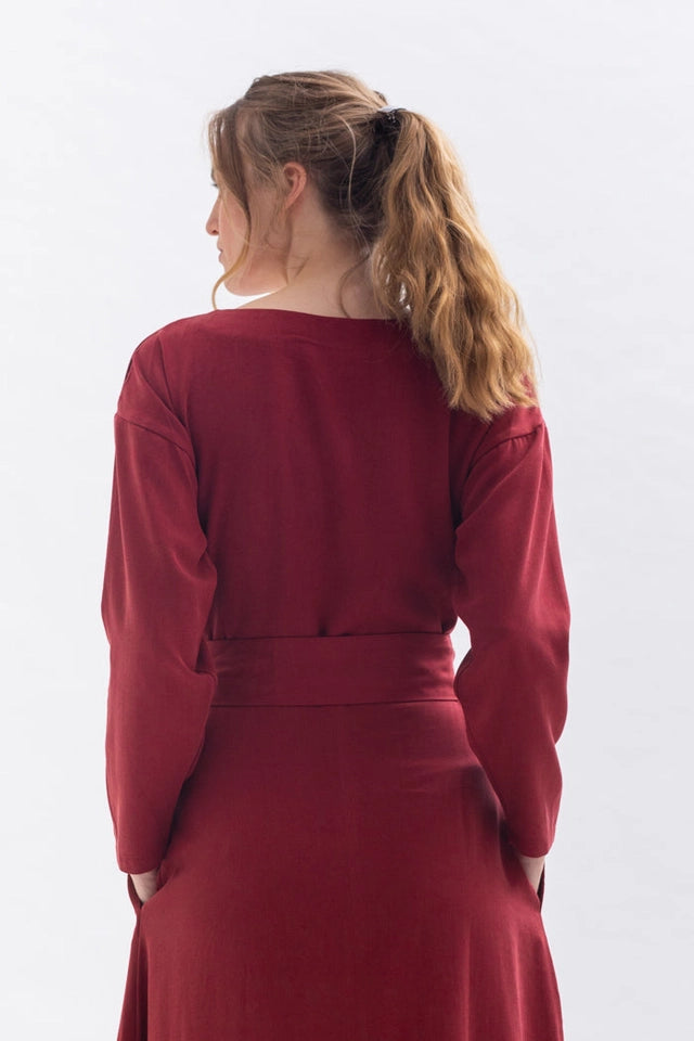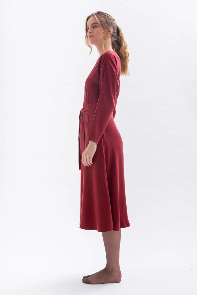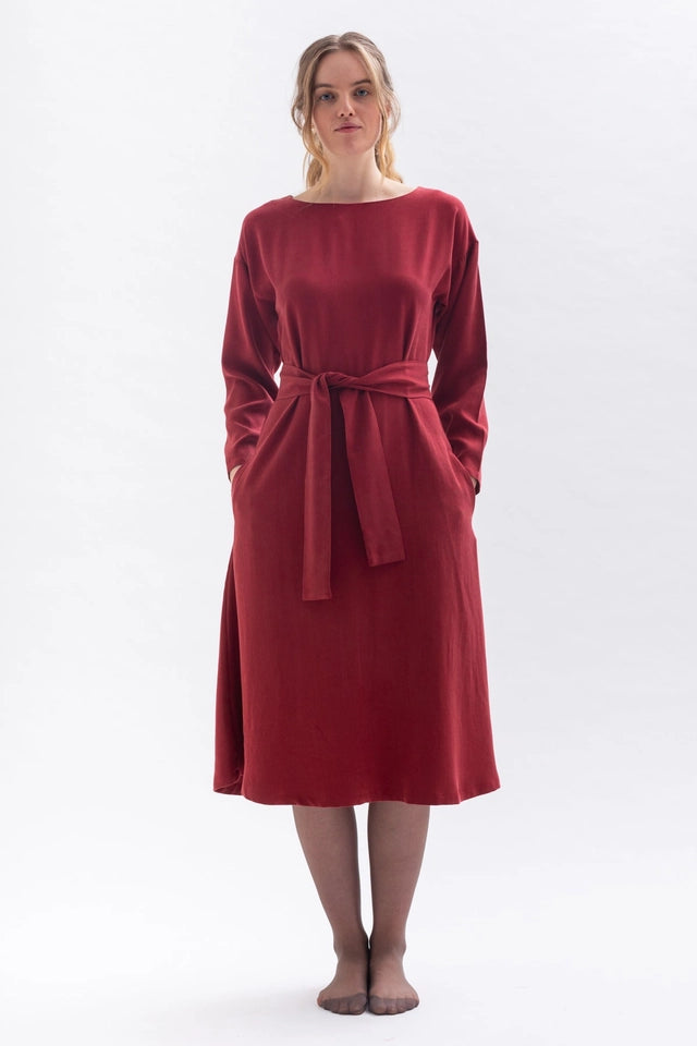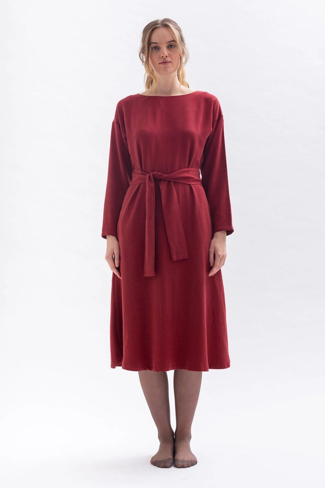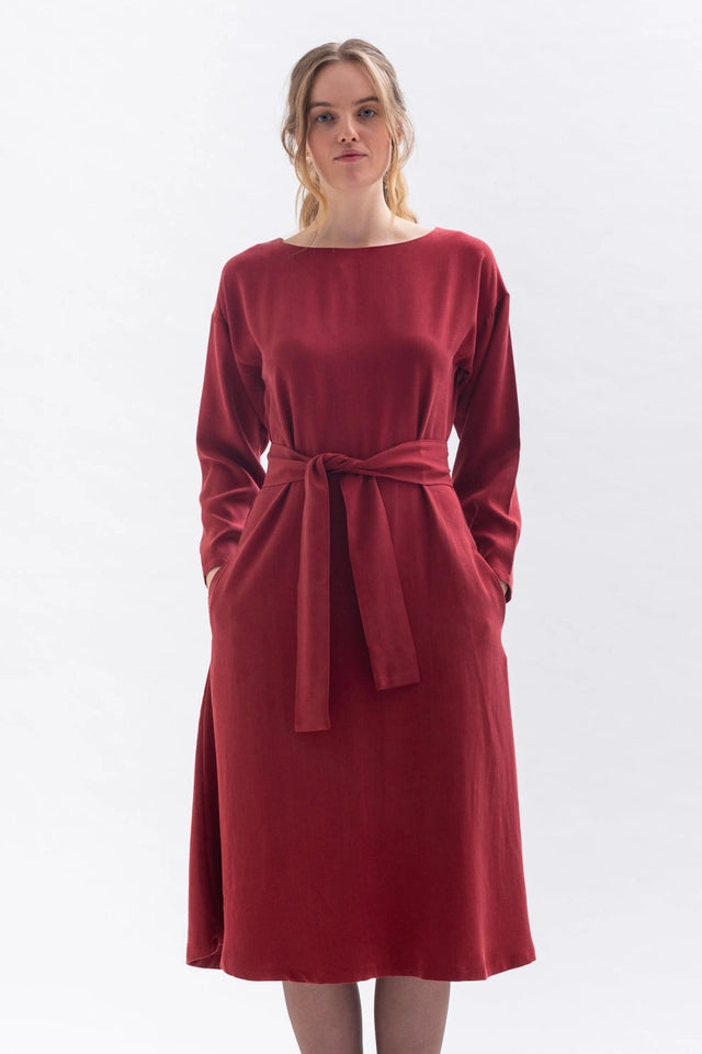 FRAN-CES Midi Dress in Merlot Red Tencel is a versatile addition to your wardrobe. This sustainable dress is made in Portugal and features a high neck and waist belt for a secure fit. The loose cut and 100% Lenzing Tencel fabric allow for maximum comfort and movement. Perfect for daily wear with sneakers or dressed up with jewelry and heels for special occasions. Care instructions: machine wash.