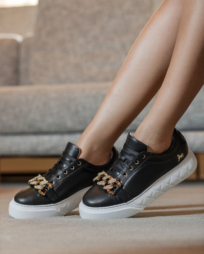 Elevate your style with Golden Grace sneakers. Handmade with lasting materials, these sneakers feature a modern platform sole for comfort and subtle height. The gold cord detail and glitter add a touch of elegance, while the round toe and adjustable laces provide a secure and comfortable fit. Step out in understated luxury.