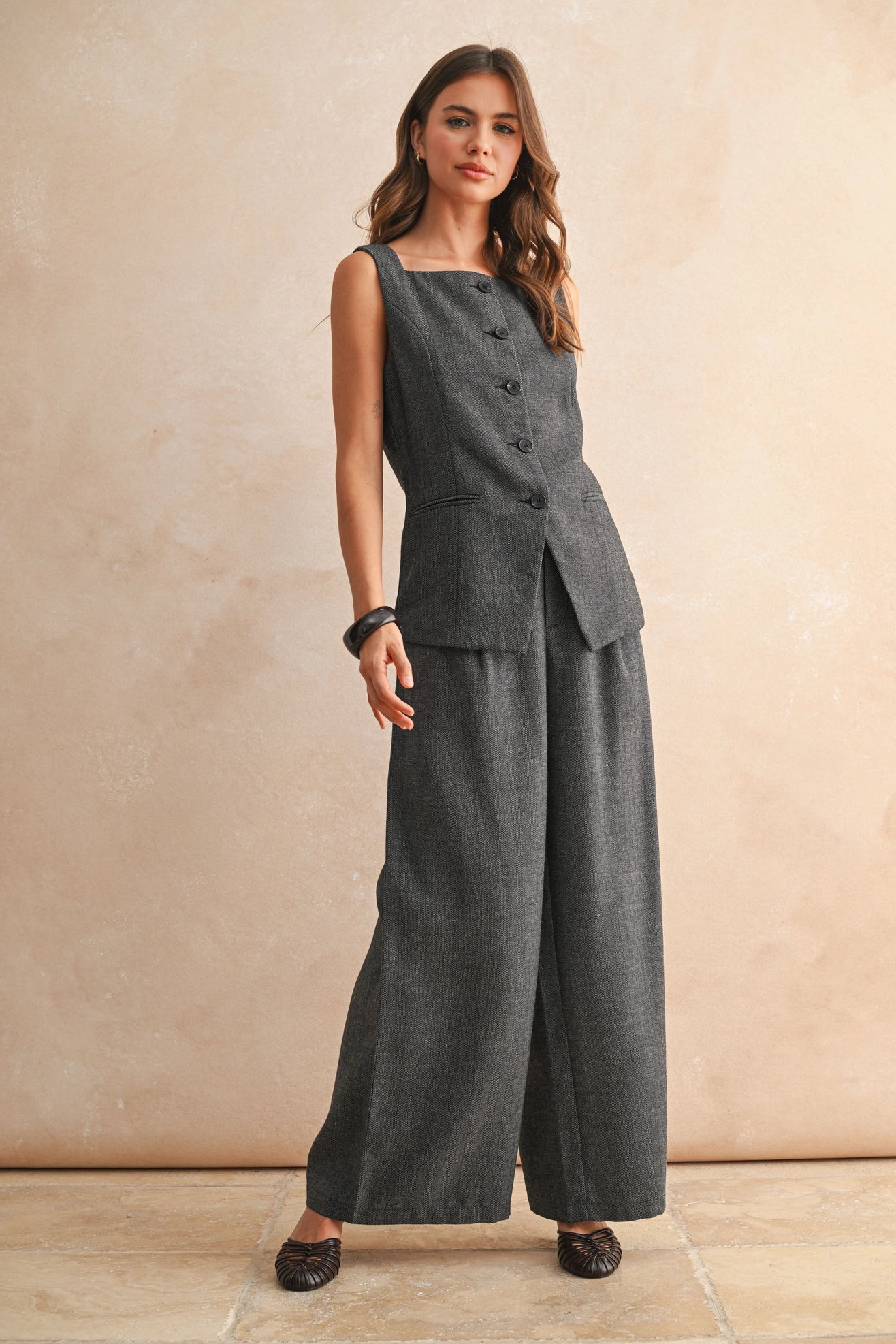 Elevate your wardrobe with these refined herringbone pattern wide leg trousers, designed for the modern professional. The flowing silhouette creates an effortlessly polished look that transitions seamlessly from office to evening. Pair with the matching J5625ST top for a coordinated ensemble. Our model, standing 5'7½", wears a size S, providing a helpful reference for fit and proportions.