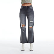Expertly crafted from a unique combination of comfort stretch and rigid denim, these high-rise straight jeans offer unparalleled comfort and style. With a natural washing effect, whisker detailing, and an irregular distressed hole design, these jeans are perfect for a laid-back yet fashion-forward look. Conveniently machine washable.