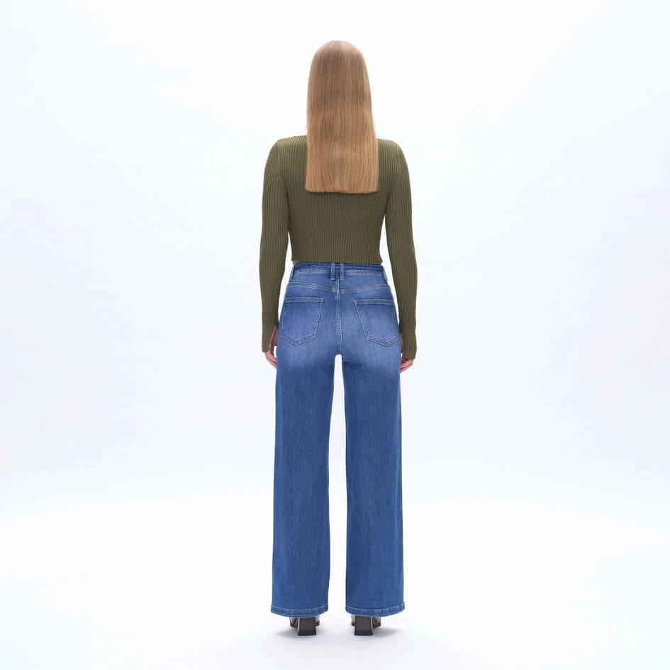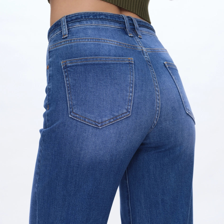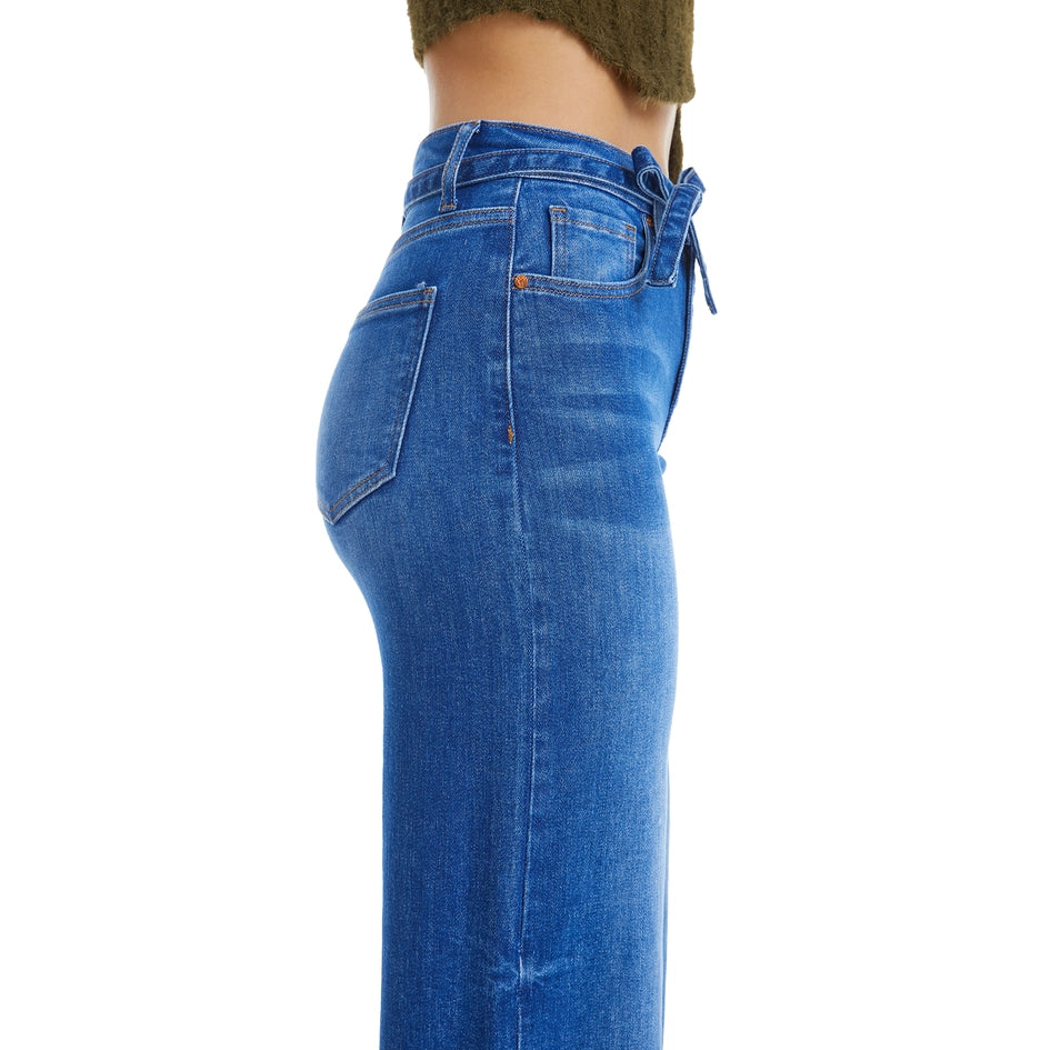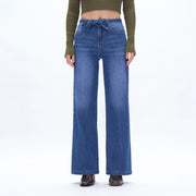 Introducing our High Rise Wide Leg Jeans, crafted from comfort stretch denim for all-day wear. The Starlight medium blue shade adds a touch of subtle charm. Features a high rise waist, five pockets, and a zipper fly for a classic look. The natural washing and whisker effects give a lived-in feel, while the raw fabric belt design adds a unique touch. Don't forget to machine wash these jeans for easy care. Perfect for pre-fall season.