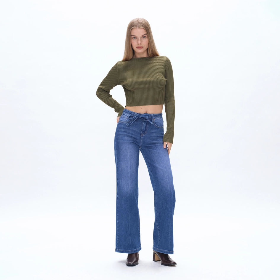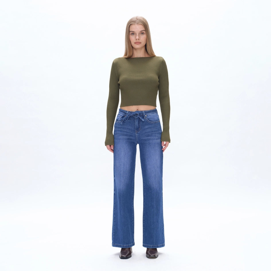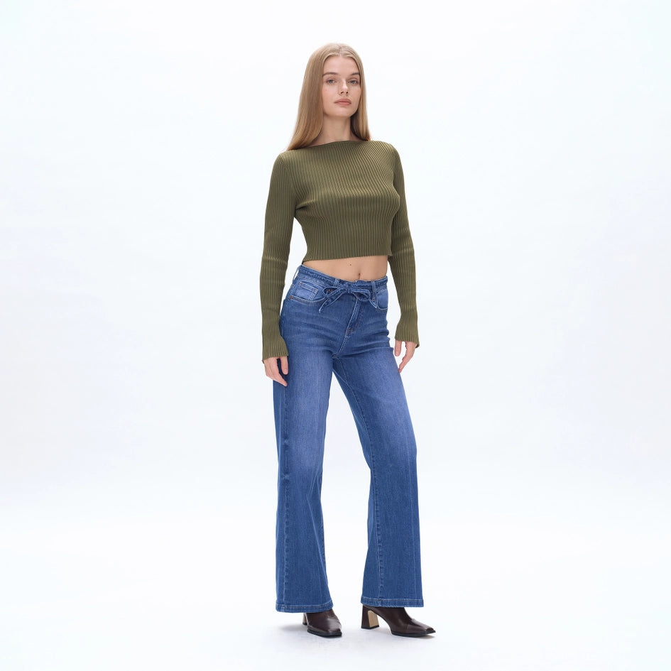High Rise Wide Leg Jeans(Finished Hem,Belt) STARLIGHT