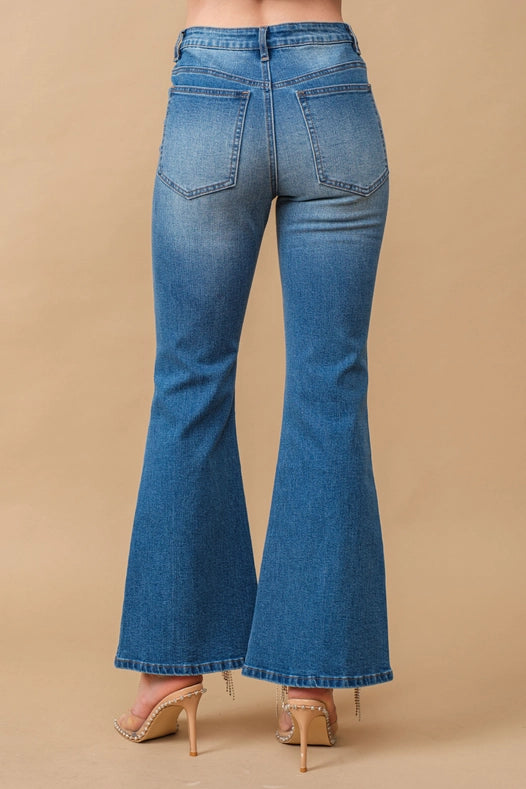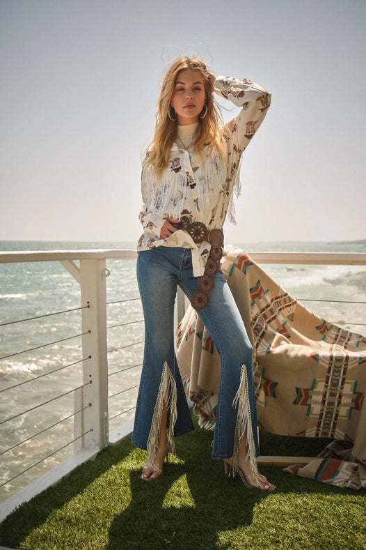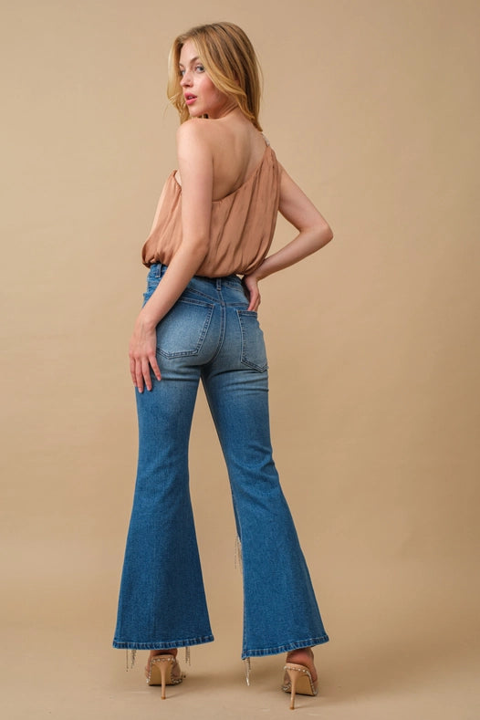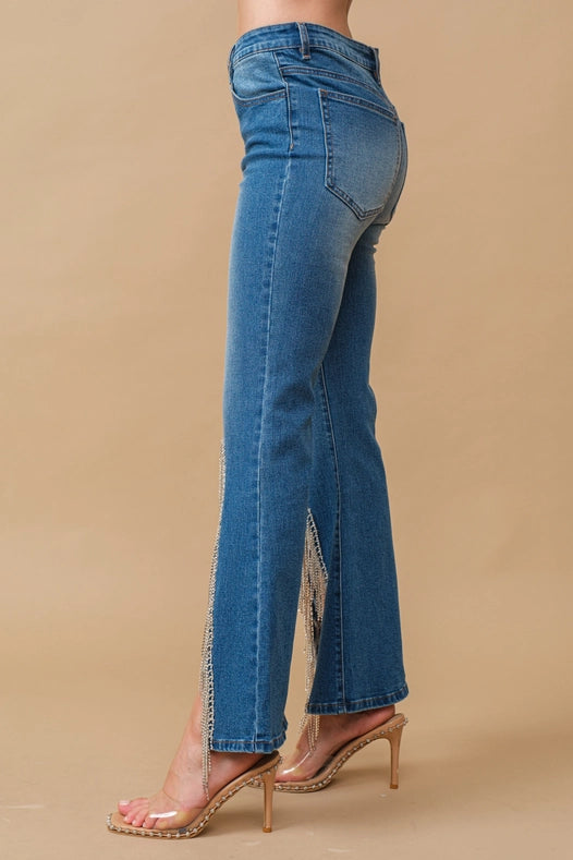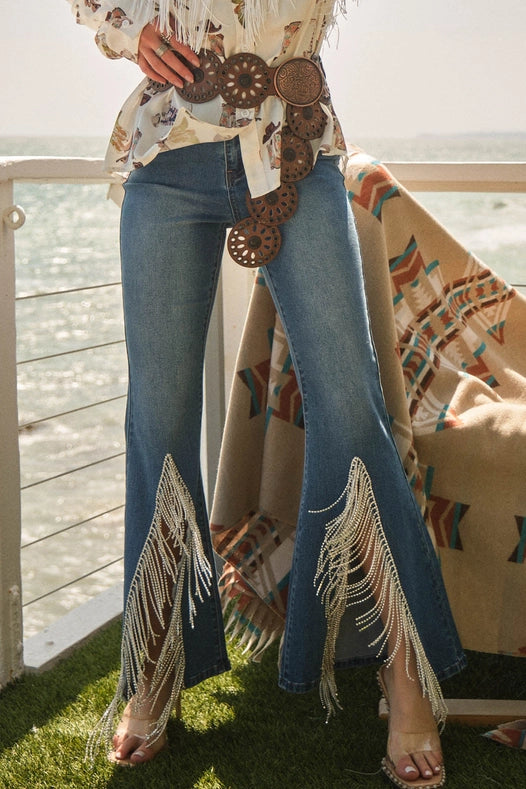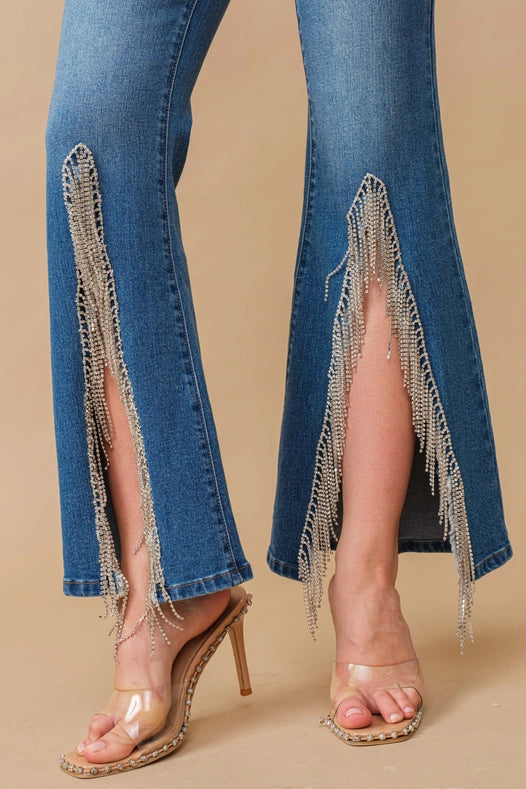 High Waist Flare Bottom W/ Rhinestone Fringe Jeans