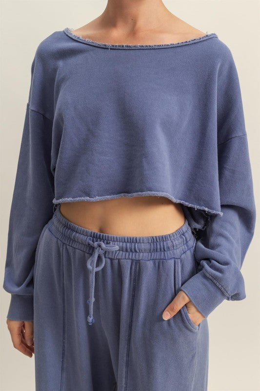 HYFVE Frayed Detail Boat Neck Long Sleeve Crop Top