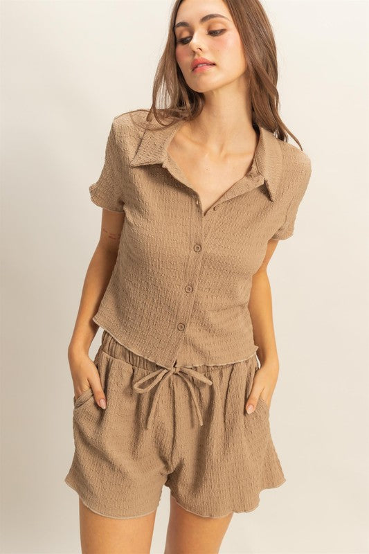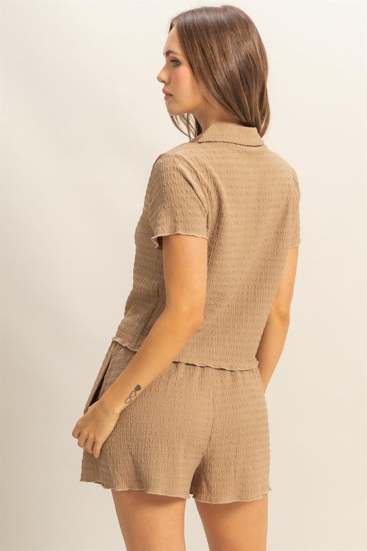HYFVE Textured Short Sleeve Top and Drawstring Shorts Knit Set