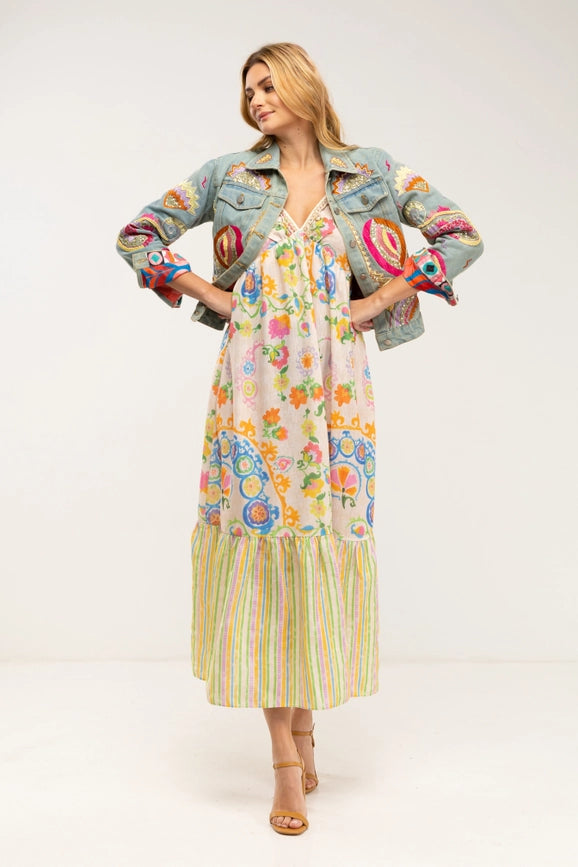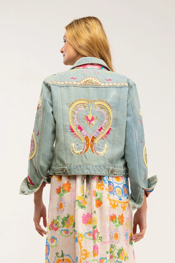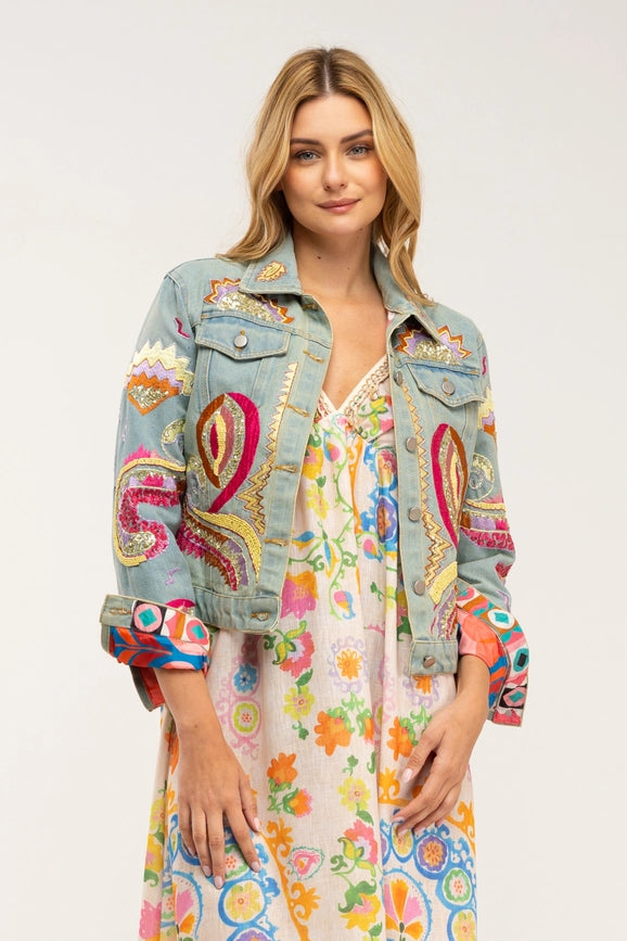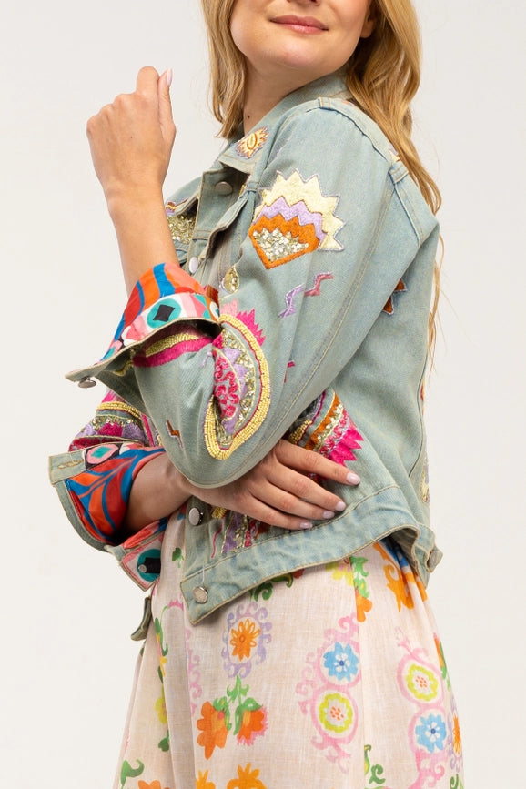 The JACKET_DENIM is a denim jacket with intricate embroidered details, sparkling rhinestones and shimmering sequins. The jacket is lined with a stylish and eye-catching print. Elevate your wardrobe with this statement piece that combines fashion and functionality.