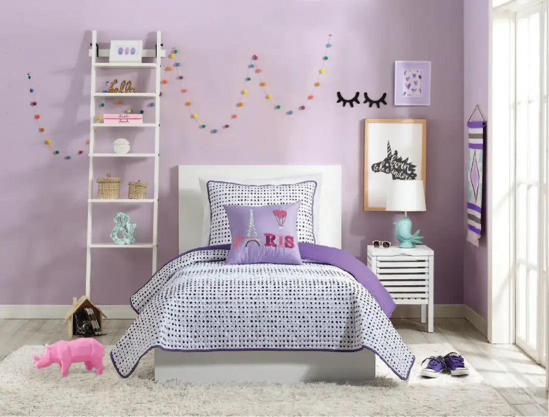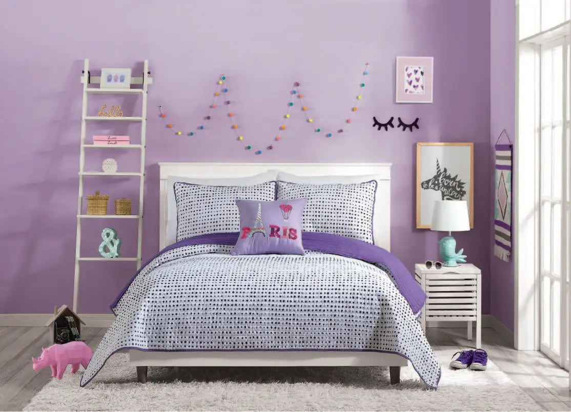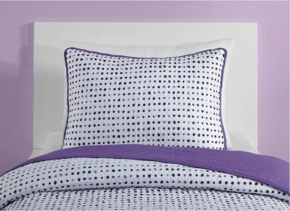 Add some whimsical style to any room with the Joceline quilt. Face has a painted dark purple polka dot print on white. Reverse is a purple solid. All fabric super soft poly. Fill is all polyester.