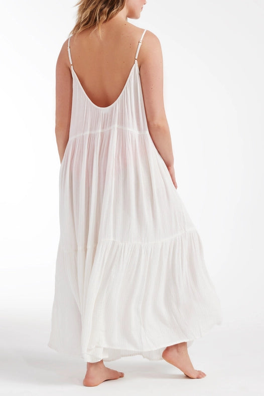 Expertly crafted in Colombia, the Johanna Flounce Dress is the perfect blend of beauty and comfort. With a low scoop back, adjustable straps, and elegant tiered gathered details, this midi coverup effortlessly transitions from daytime to nighttime wear. Experience easy, effortless, and elegant style with the Johanna.