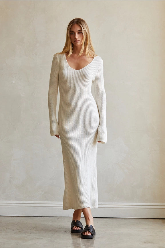Stay warm and stylish with the Joline Textured Rib Sweater Dress. Enjoy the comfort of 100% cotton while looking effortlessly chic in this maxi length dress with a deep V-neckline, long sleeves, and a fitted bodice. The soft ribbed knitting adds texture and dimension, making it the perfect addition to your winter wardrobe. Available in multiple sizes.