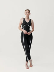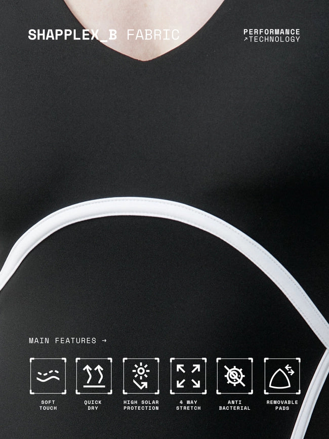 The Jumpsuit Size 2.0 Black/Off White is designed for medium support and features "Shapplex_B" performance technology fabric, providing shaping and a flattering silhouette. Its double fabric waistband and contrasting piping add a stylish touch. With a "V" front neckline and 4 way stretch fabric, this jumpsuit offers high solar protection, softness, and quick drying capabilities.