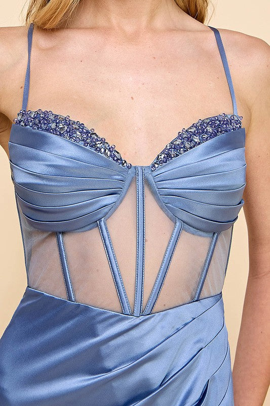Ladies Bead Detail Shirring Satin Maxi Dress Dusty Blue