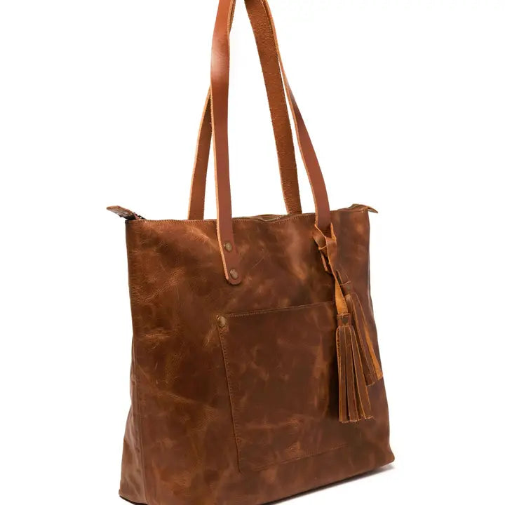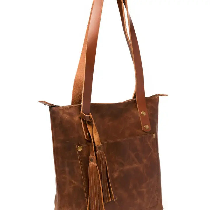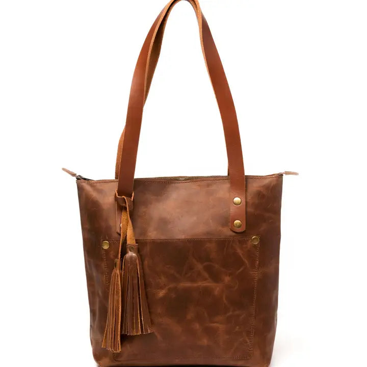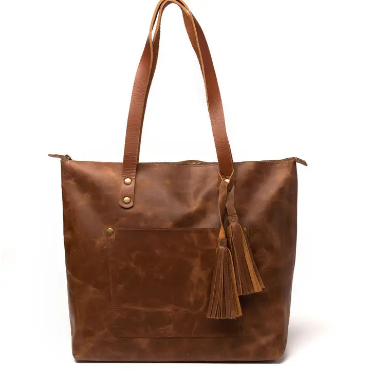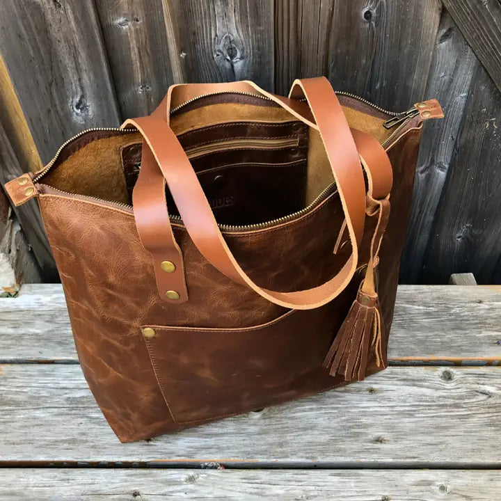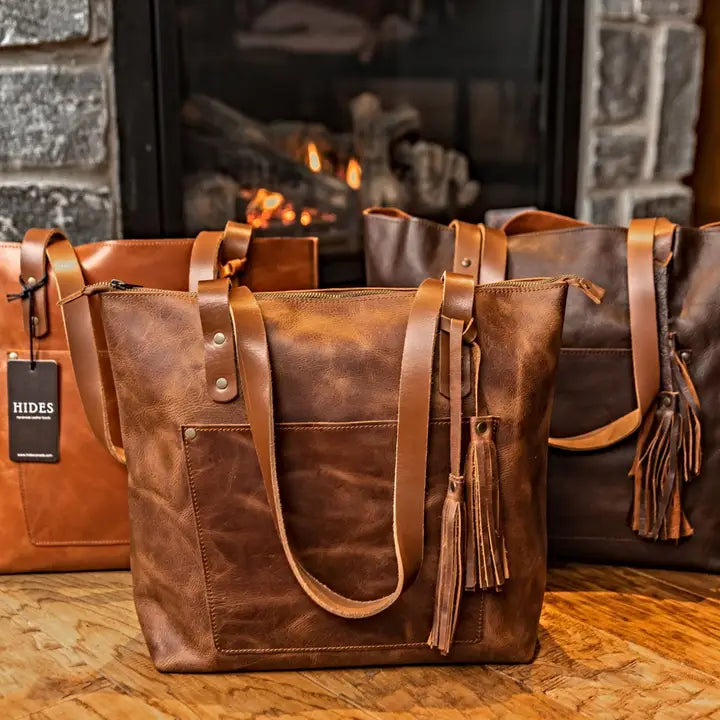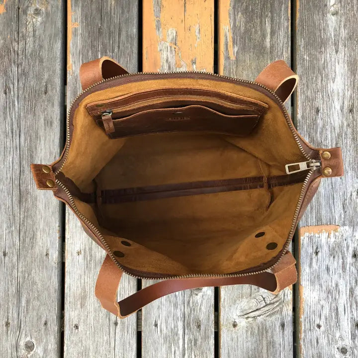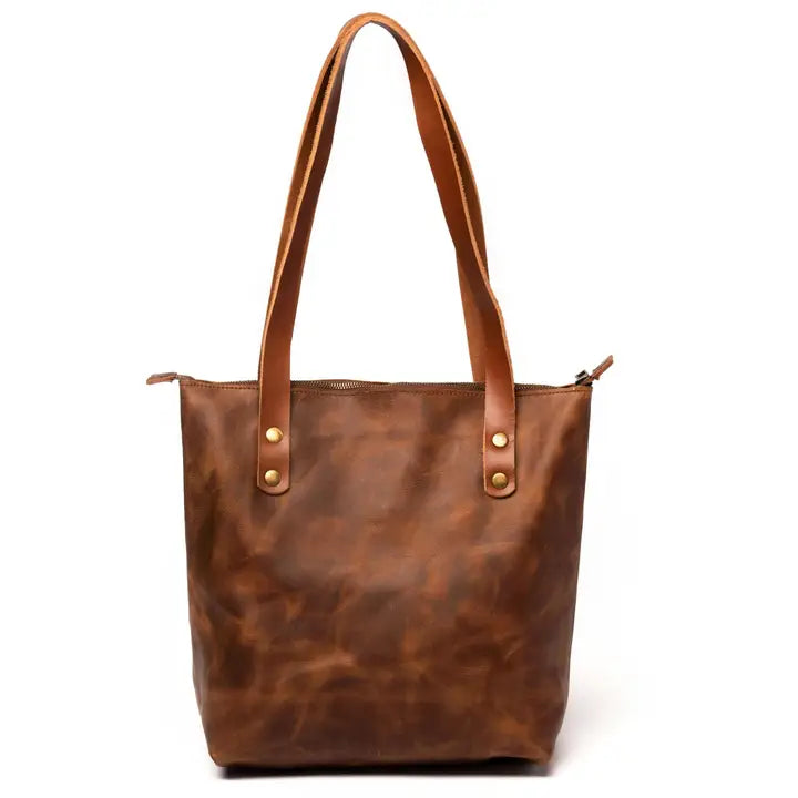 This Leather Tote with Zipper combines timeless style with practical design, crafted from durable full-grain vegetable-tanned leather in a rich brown hue. Its minimalist silhouette and reinforced twin leather handles ensure both elegance and strength. Available in three sizes, it features a secure zippered main compartment spacious enough to carry essentials like laptops, books, and daily accessories. Designed for everyday use, this tote offers lasting quality and versatility, making it an ideal companion for work or weekend outings.