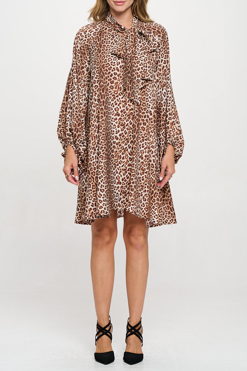 Leopard Print Puff Sleeve Dress with Front Neck Tie Detail