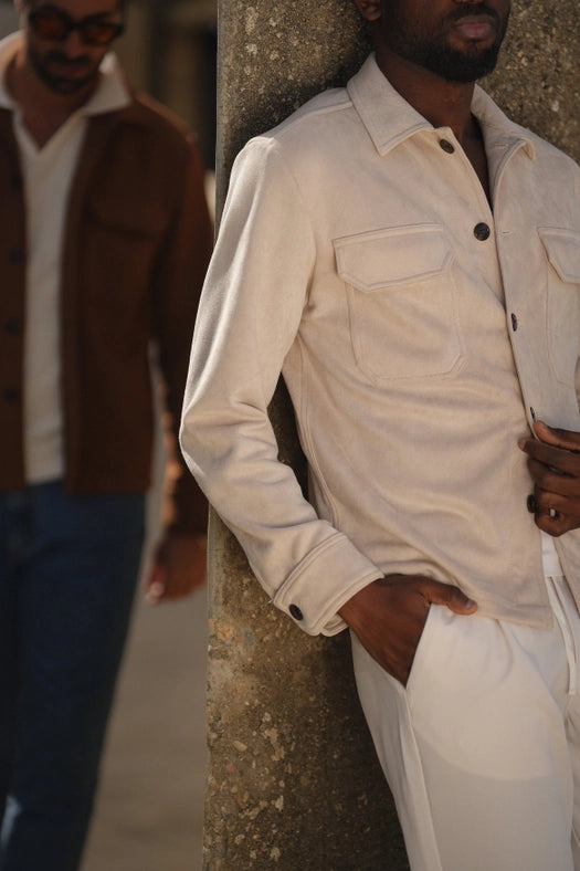 This Light Beige Suede Outershirt exudes sophistication and functionality, crafted from soft calf suede for a luxurious touch. With a classic collar, button fastening, and logo-embossed buttons, it offers both convenience and style with two chest pockets and front welt pockets. The straight hemline complements the classic silhouette, making it a versatile piece for any occasion. Made with 95% cotton and 5% elastic, it provides a comfortable regular fit.