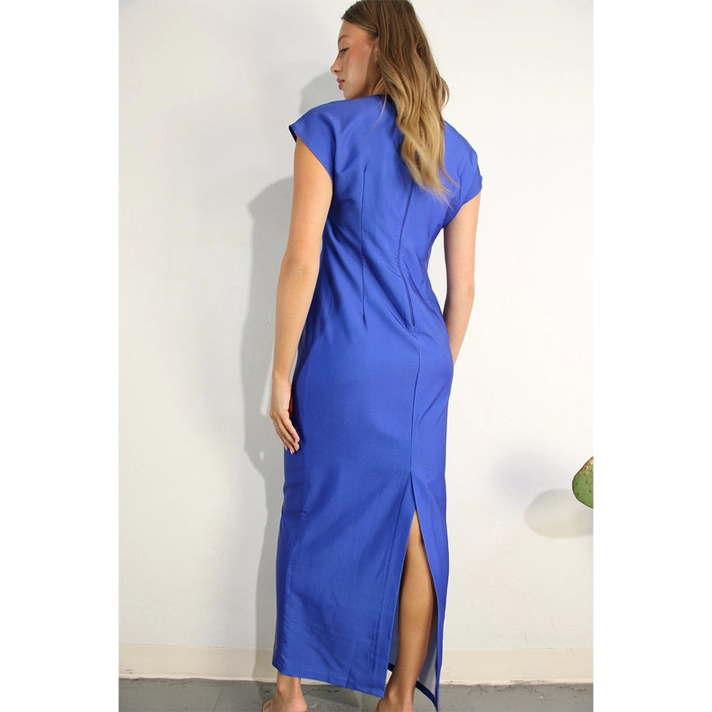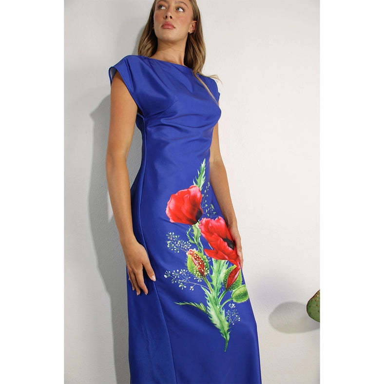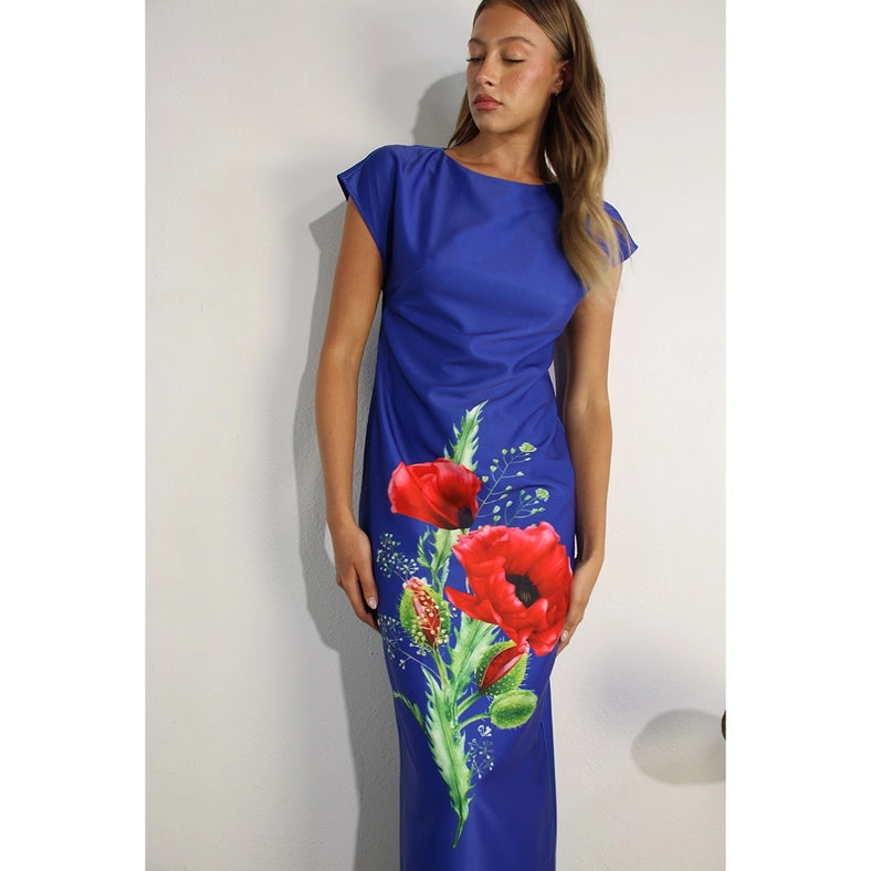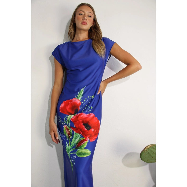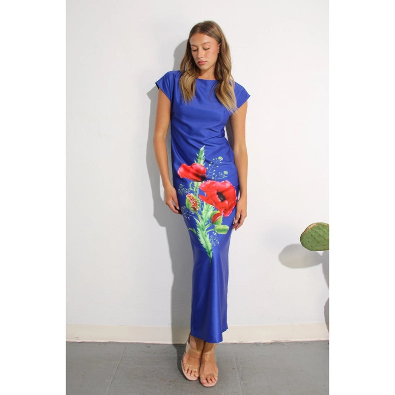 Expertly crafted with a 95% polyester and 5% spandex blend, our long dress features an elegant front flower print. Designed to flatter all body types, this dress is perfect for any occasion. Available in size small, it is sure to become a staple in your wardrobe.
