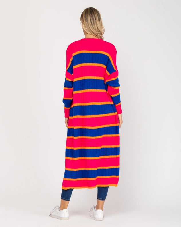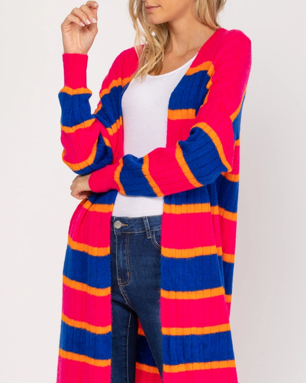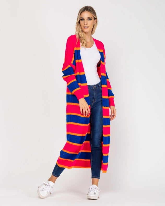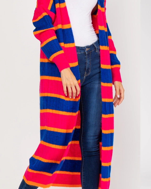 This long open knit jacket features stylish stripes, providing a versatile and timeless addition to your wardrobe. Made from high-quality materials, it offers both comfort and durability. Perfect for layering and adding a touch of sophistication to any outfit.