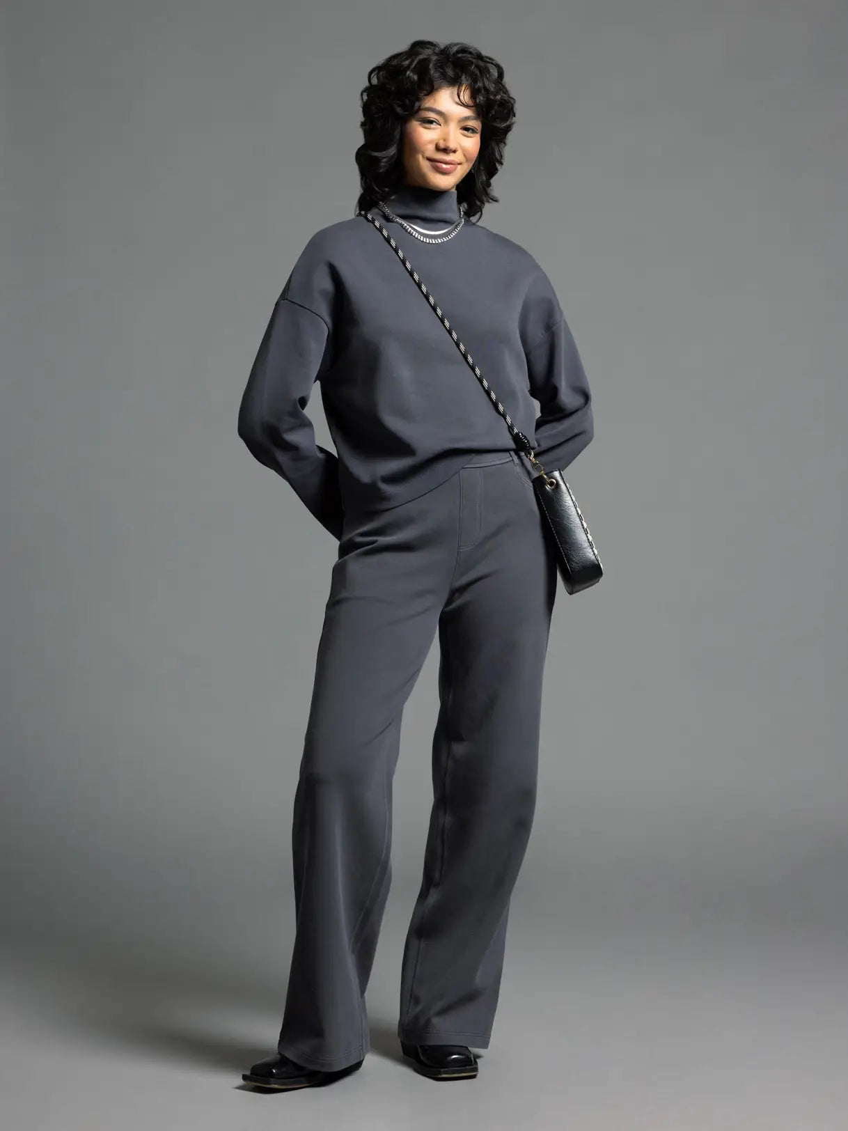 This long-sleeved Genevieve Mock Neck Top offers a refined silhouette with a comfortable drop shoulder design. Crafted from a soft blend of 80% cotton, 14% nylon, and 6% spandex, it delivers stretch and durability while maintaining breathability. With a 22-inch length and a 20-inch chest in size small, it provides a tailored yet relaxed fit ideal for layering or standalone wear. The mock neck adds subtle sophistication, making this top a versatile addition to any wardrobe.
