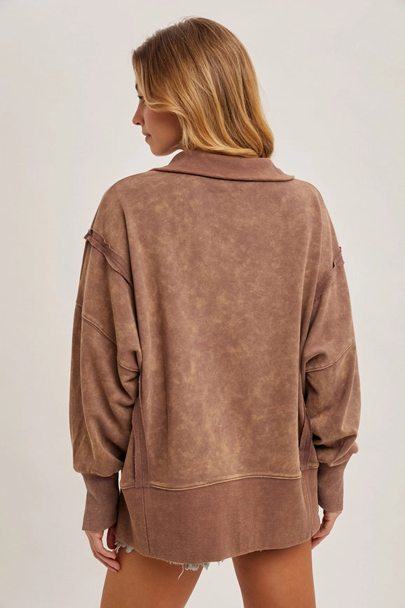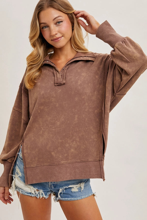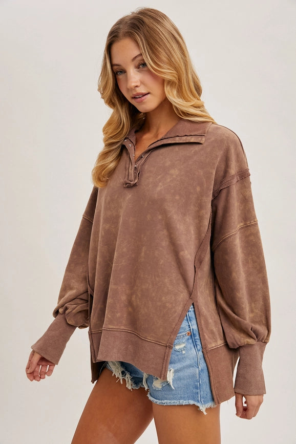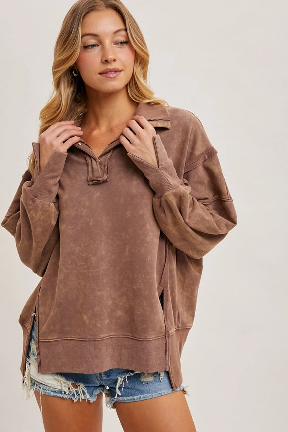 Long Sleeve Washed Side Slit Henley Sweatshirt MOCHA