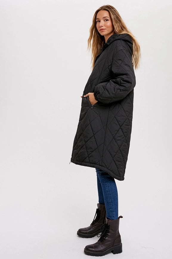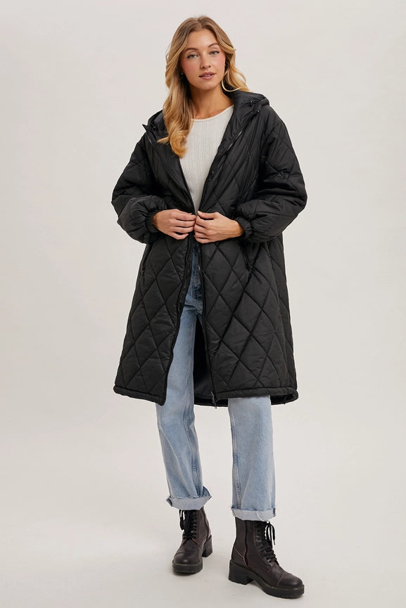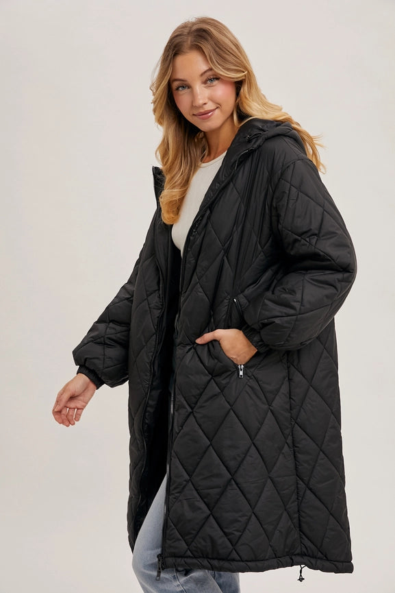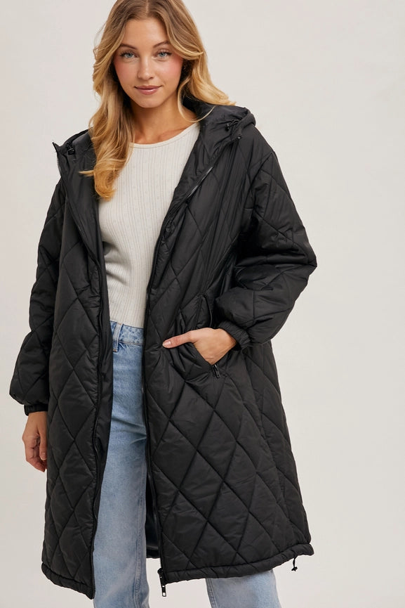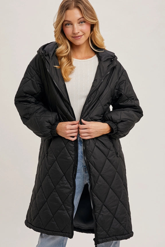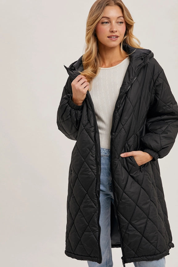 Stay stylish and warm with our Longline Quilted Puffer Jacket. Featuring a functional hoodie, zipper front, and lightweight woven outerwear, this jacket offers both fashion and practicality. The quilted design provides insulation and warmth, perfect for cooler weather. A must-have versatile addition to your wardrobe.