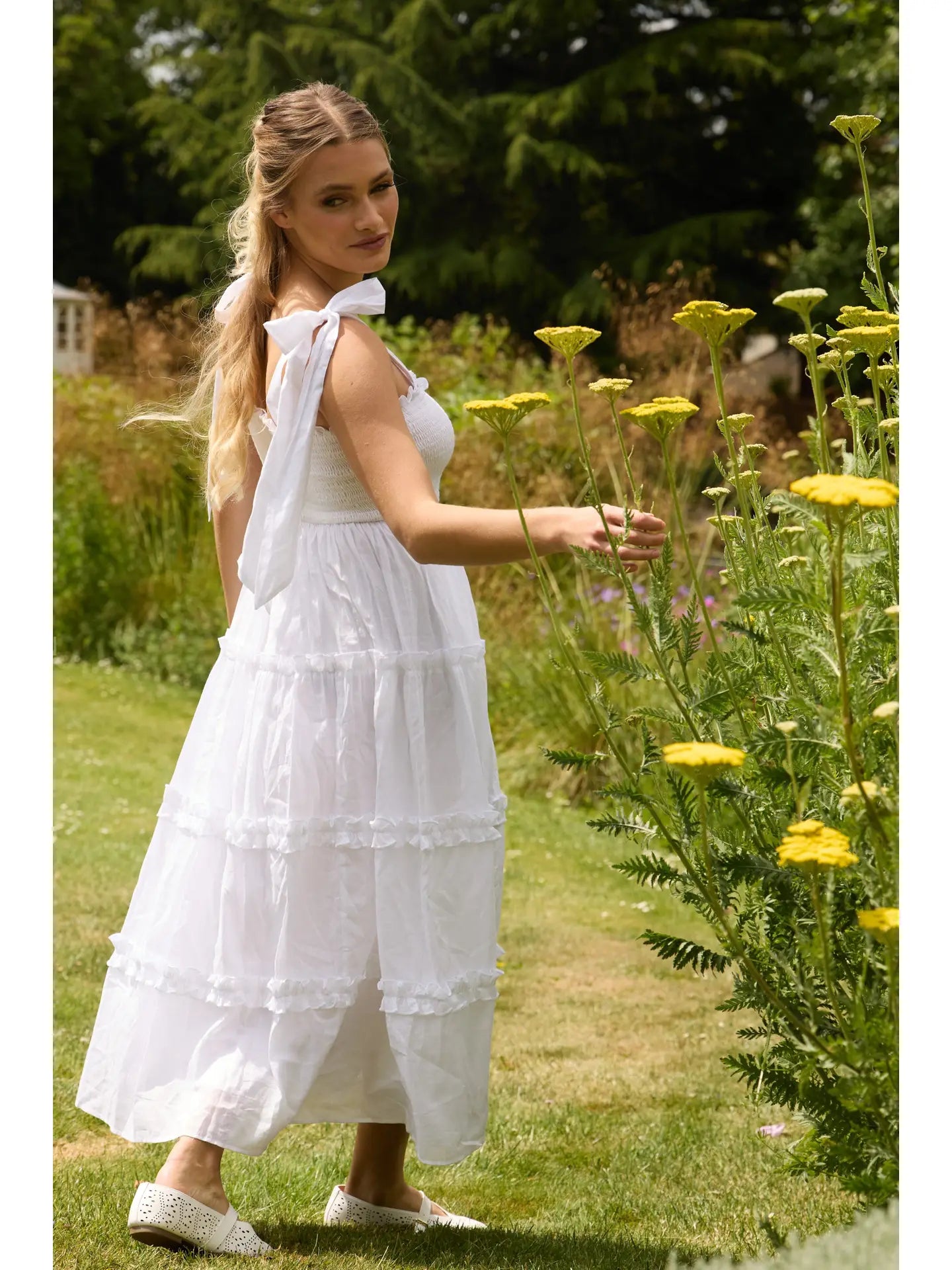 The Louise Cotton Midi Dress in White by Lace & Beads is a versatile summer staple designed for comfort and style. Made from breathable cotton, it features a straight neckline and a fully smocked bodice that adapts to your shape for a flattering fit. Adjustable tie straps add a customizable touch, making it perfect for warm-weather occasions like picnics, garden parties, and weekend escapes. This dress combines effortless elegance with practical comfort, ideal for any relaxed summer event.