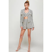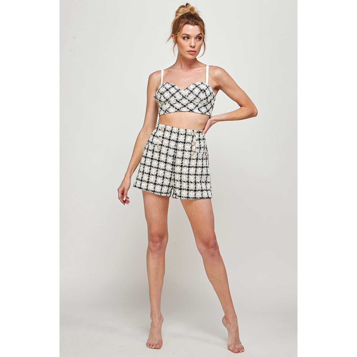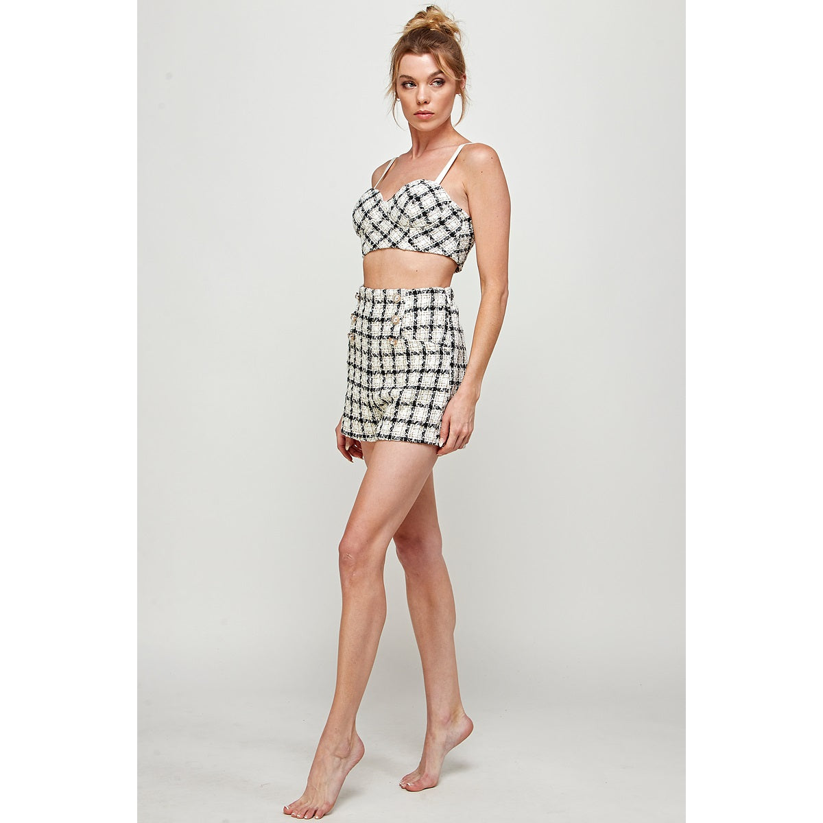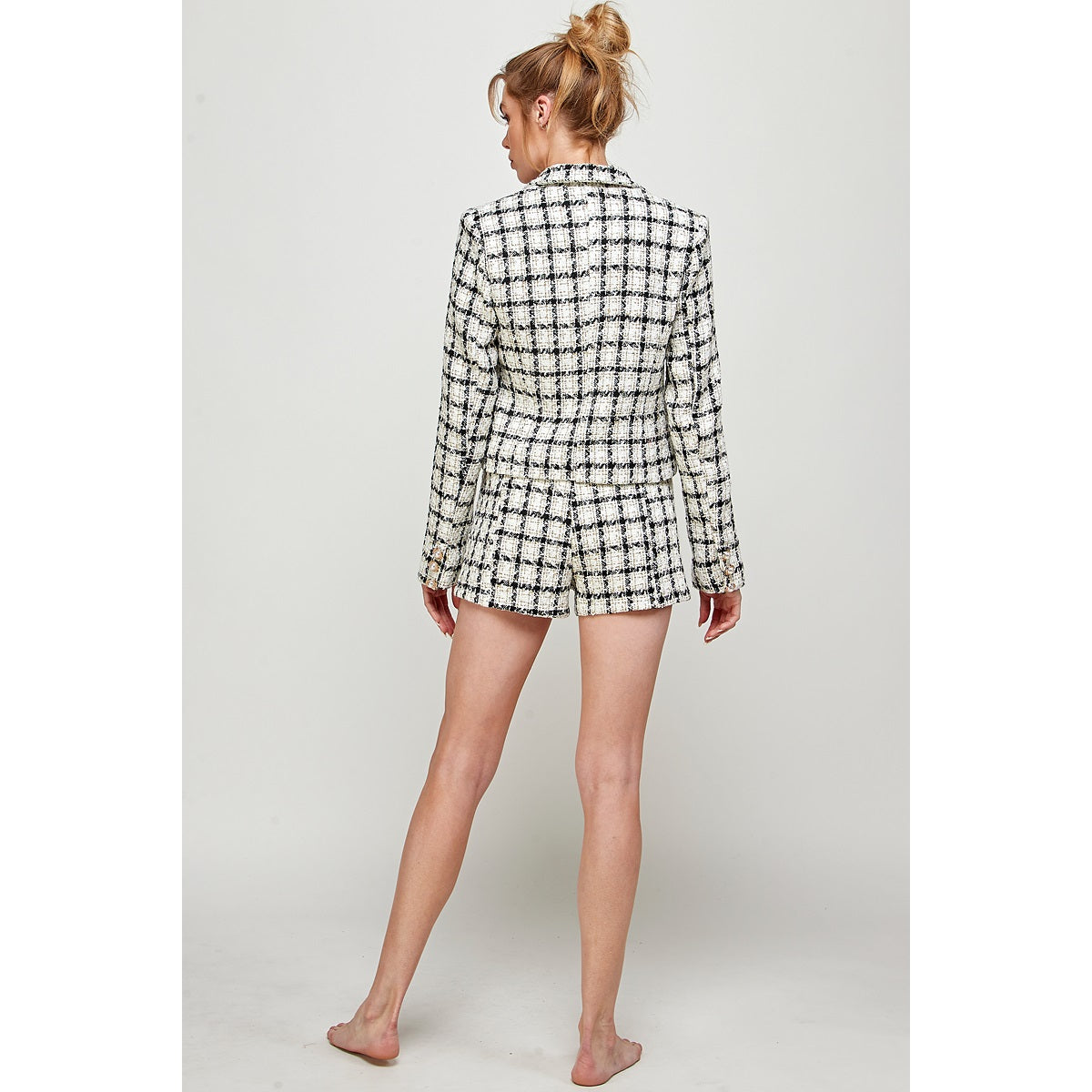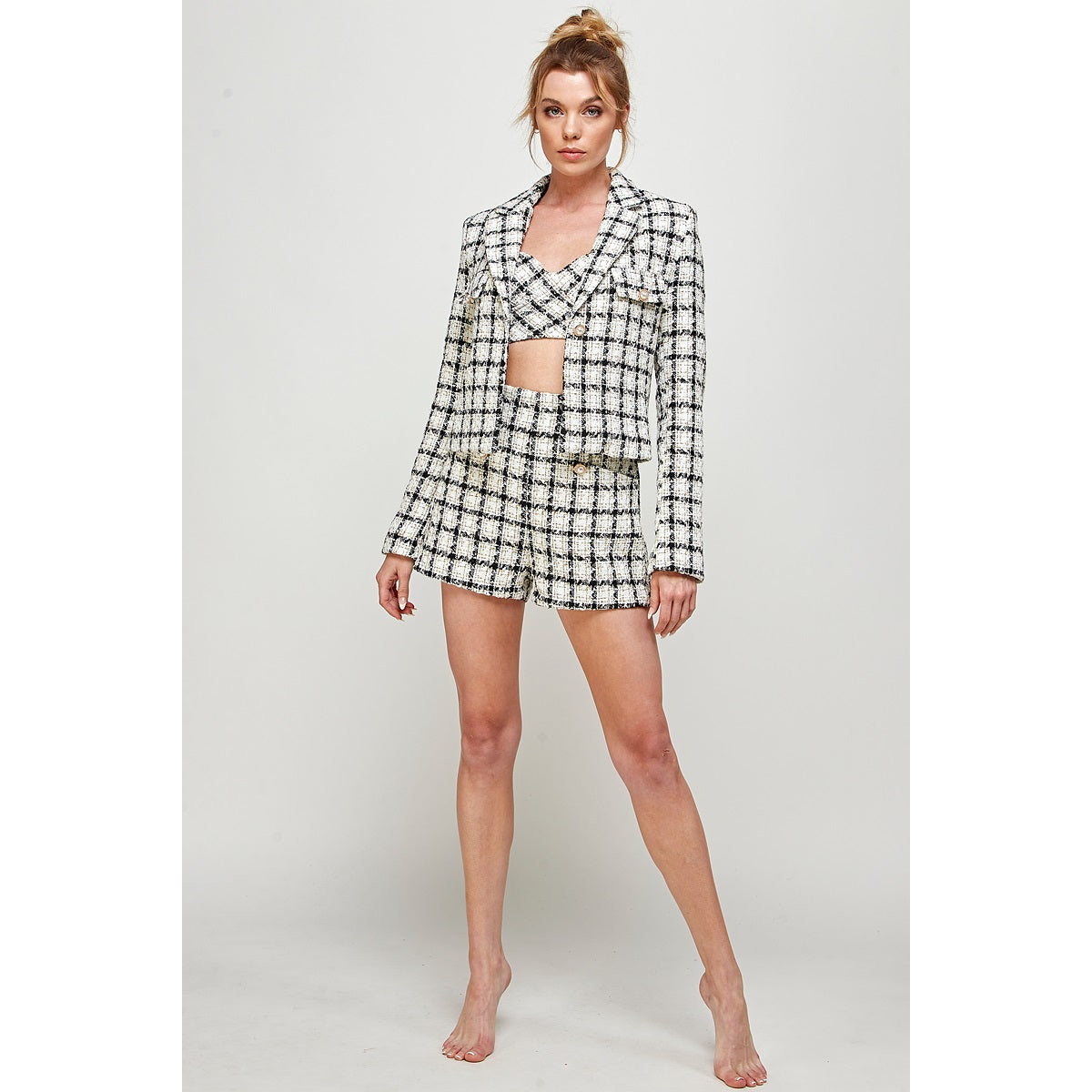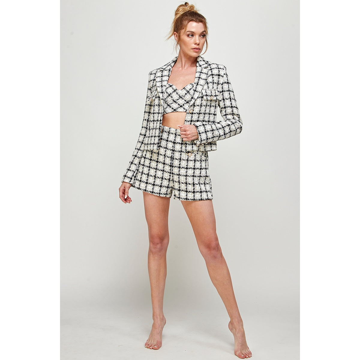 Look fashionable and stylish in this tweed 3 piece set with blazer, bralette, and wide-leg relaxed fit shorts.