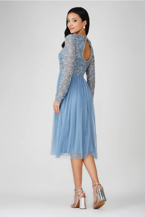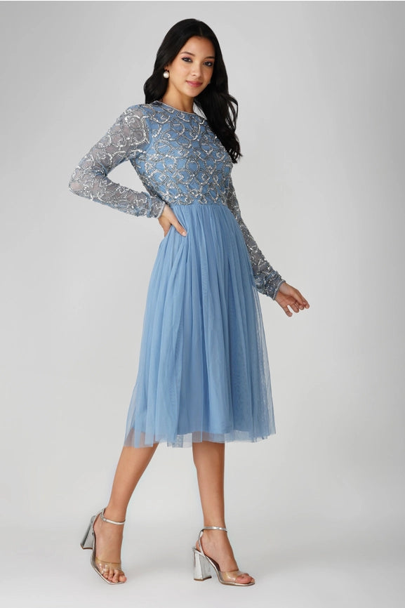 Expertly crafted in India, the Mandarin Embellished Midi Dress in Powder Blue is a stunning choice for any special occasion. Its sequin and pearl studded bodice, delicate lace and bead detailing, and elegant long sleeves exude a sense of luxury and sophistication. The A-line tulle skirt adds volume and movement, making this dress the perfect combination of elegance and glamour.