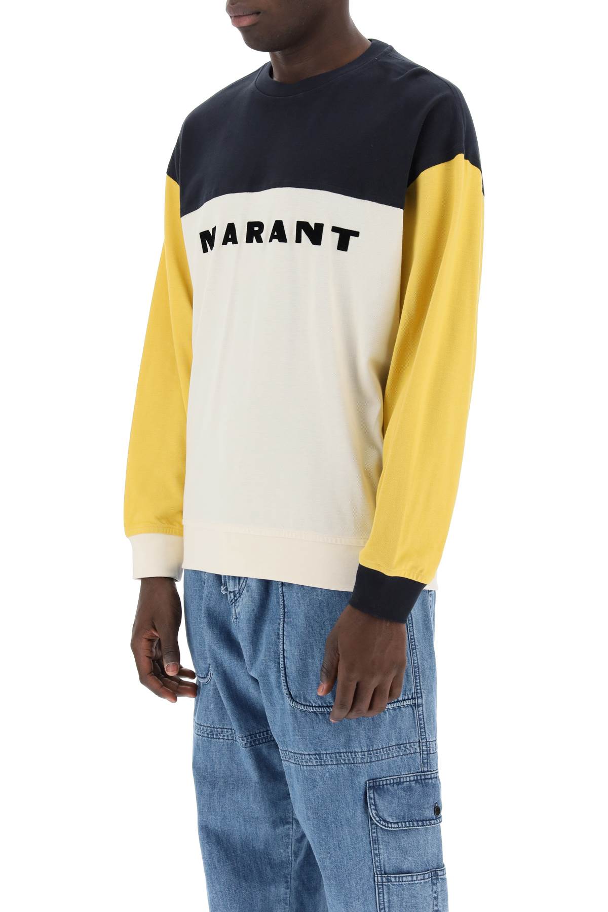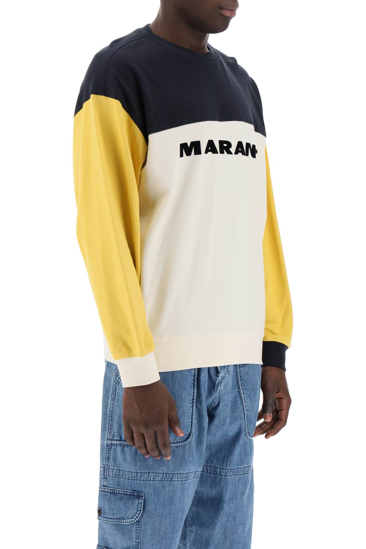 Introducing the Marant aftone color block pique sweatshirt. Made from lightweight cotton piqué jersey, this crew-neck sweatshirt boasts a color-blocked design adorned with flocked Marant lettering for a unique touch. The loose fit, dropped shoulders, and ribbed trims provide comfort and style. Available in size L for individuals up to 187 cm tall.