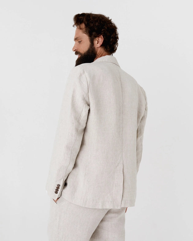 Elevate your style with the Men's Heavyweight Linen Blazer Salvador. Crafted from high-quality, heavyweight linen, this blazer features a faux chest pocket, applied front pockets, and three coconut button closure. The sleeves also have non-functional coconut button closures for added sophistication. Made in Lithuania for a classic fit.