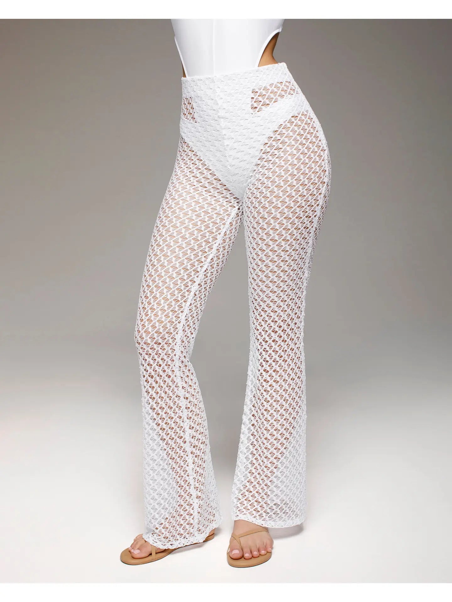 The Merletto Flare Pant offers a refined take on retro glamour with its crochet-inspired, breathable fabric and flattering flared silhouette. Designed for versatility, it layers effortlessly over swimwear or stands out as a chic, lightweight option for everyday wear. Featuring a logo elastic waistband and an invisible side zipper, this slim-fit pant combines comfort with subtle detailing. Crafted in Canada, it ensures quality and timeless style. Available in multiple inseam lengths with a supportive medium-rise waistband, it balances form and function for a polished look. Care instructions recommend gentle washing and line drying to maintain its delicate texture.