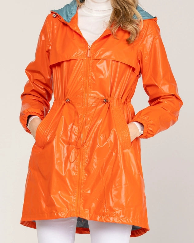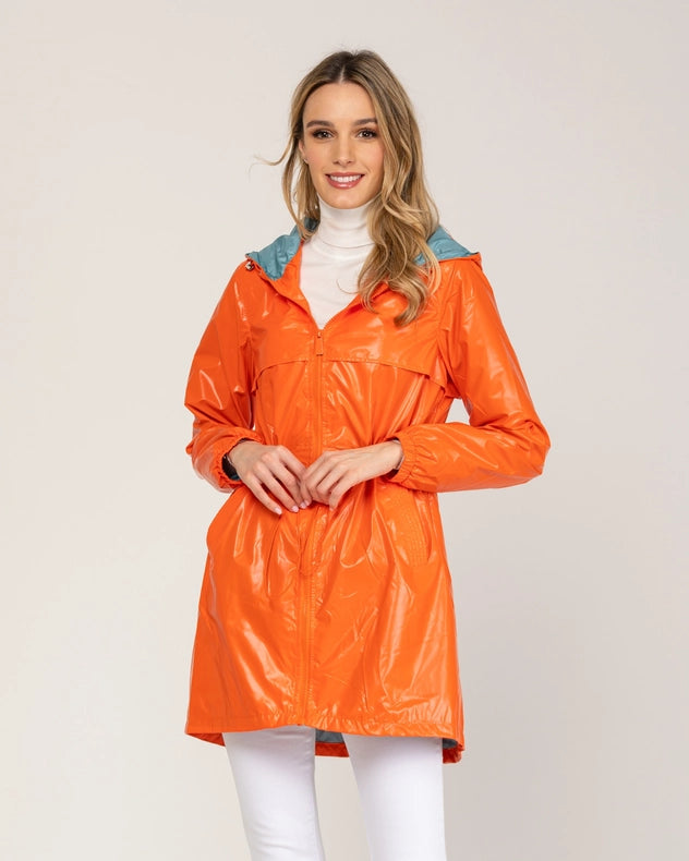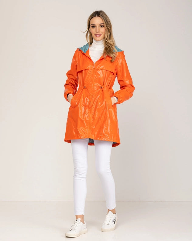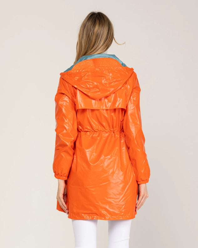 Metallic Padded Short Anorack With Hood, Zip And Buttons Orange