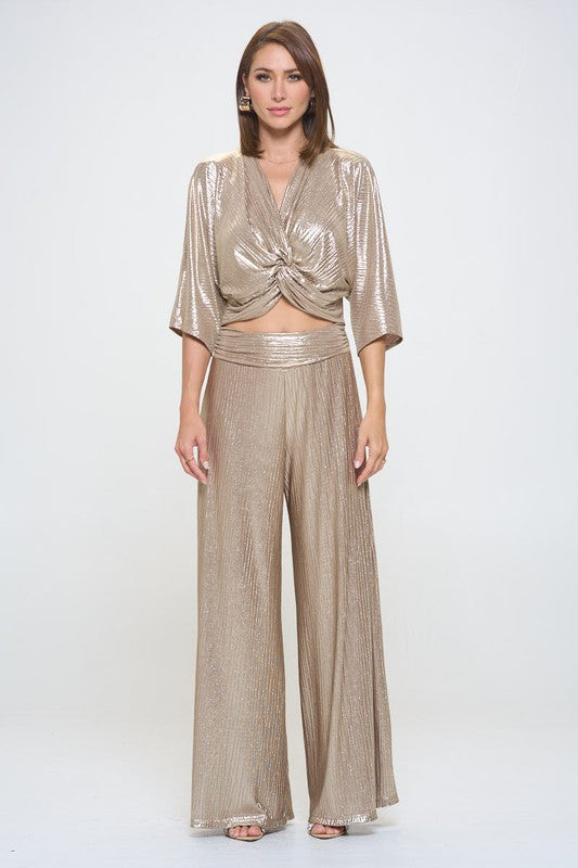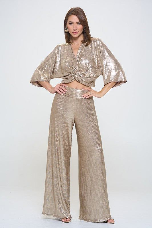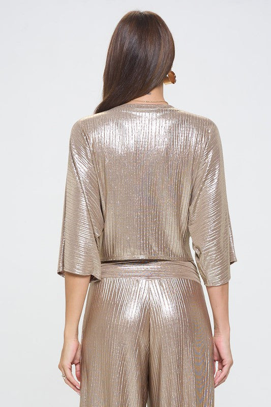 Made in USA Metallic Print Short Sleeve Top w Front Twist. Fabric content: 95% Polyester, 5% Spandex.