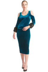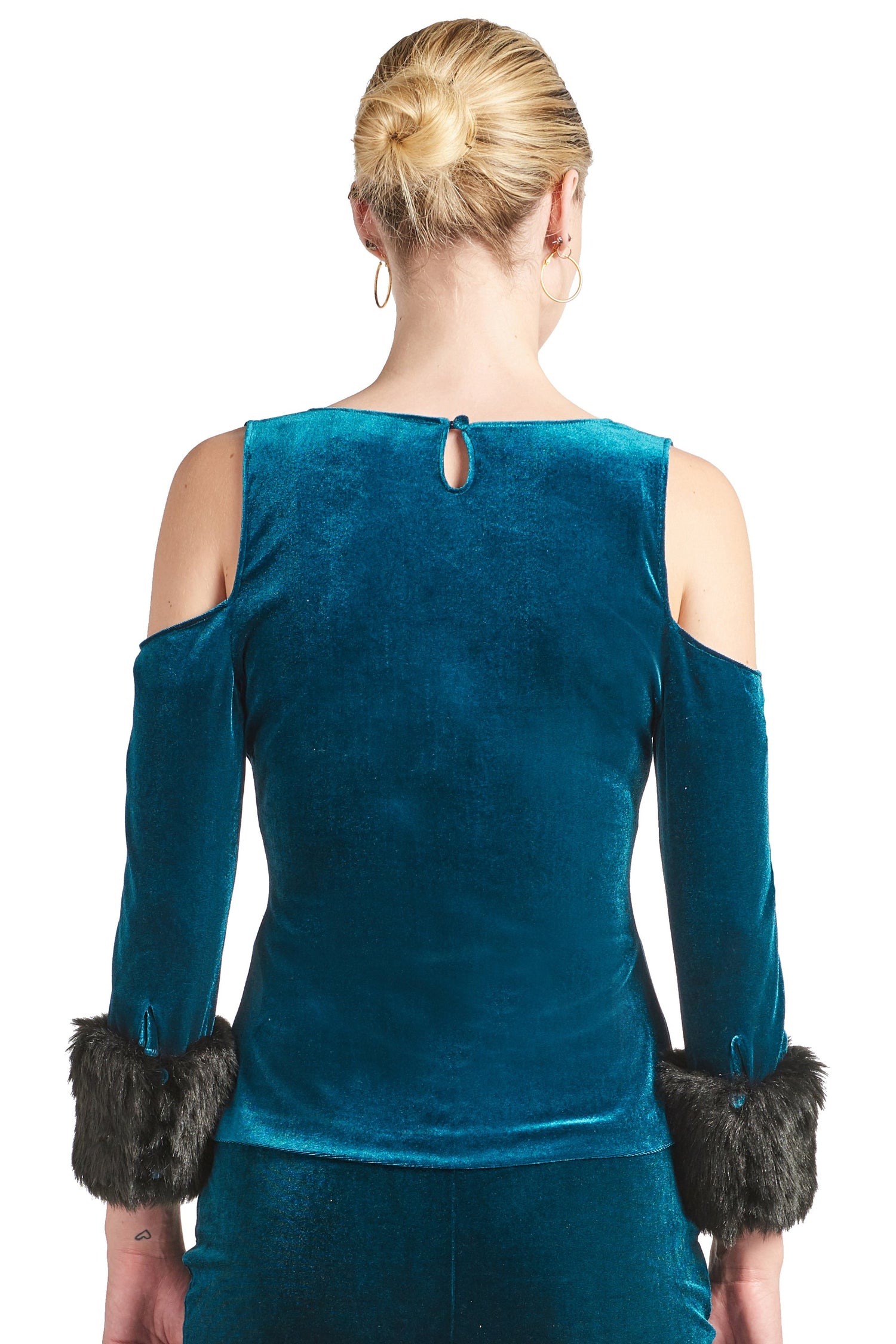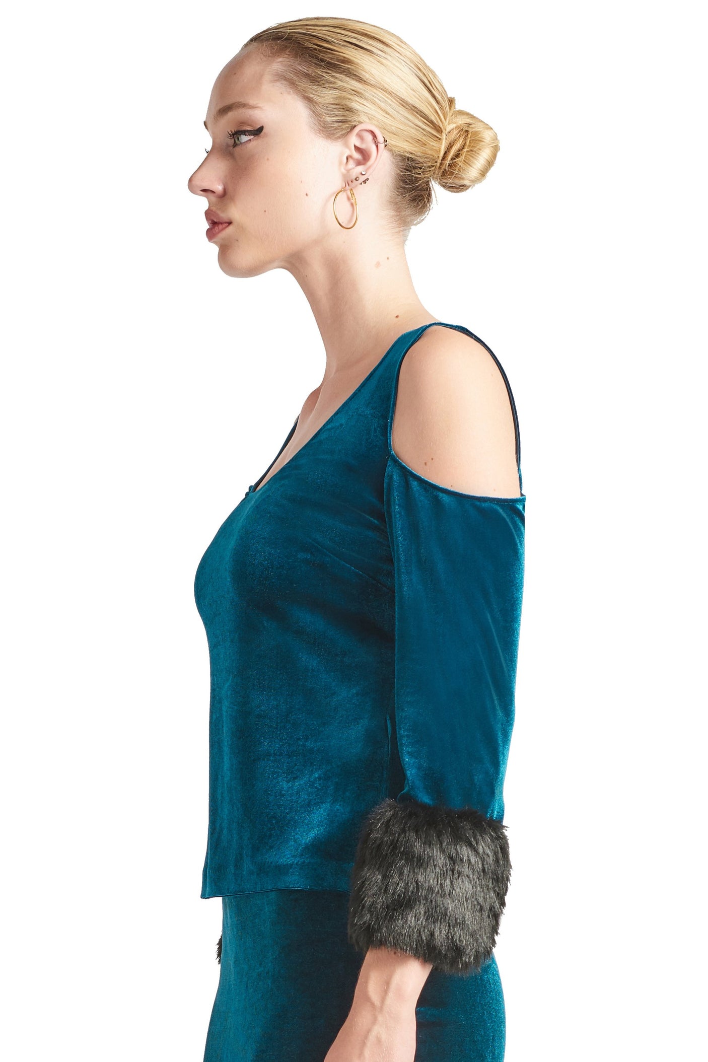 Stand out in our cut-out Mia Top. This top is made from luxurious velvet fabric with cold shoulder cut-outs and topped off with glamorous contrast lush soft faux fur arm cuff detailing, that is sure to elevate your style. Pair this fun top with our Tia Velvet Skirt in teal, or style it your way with a black pant or skit to complete the look.