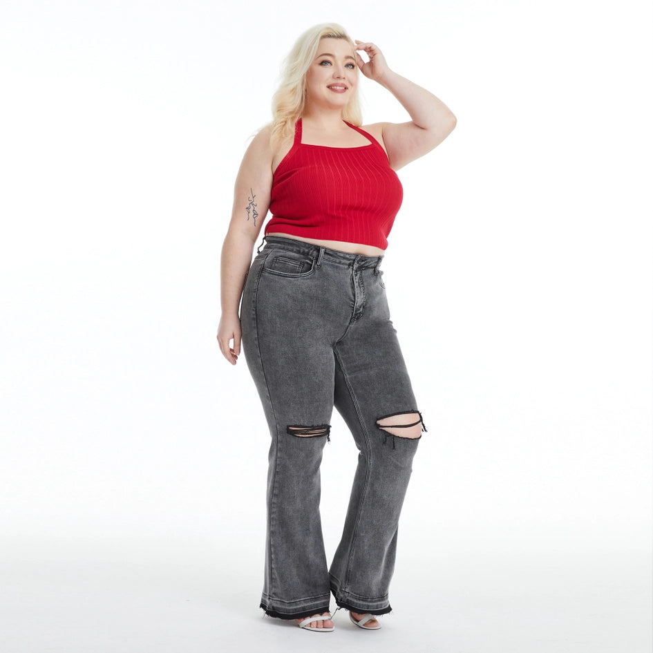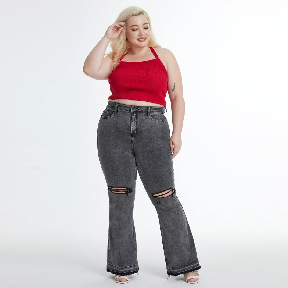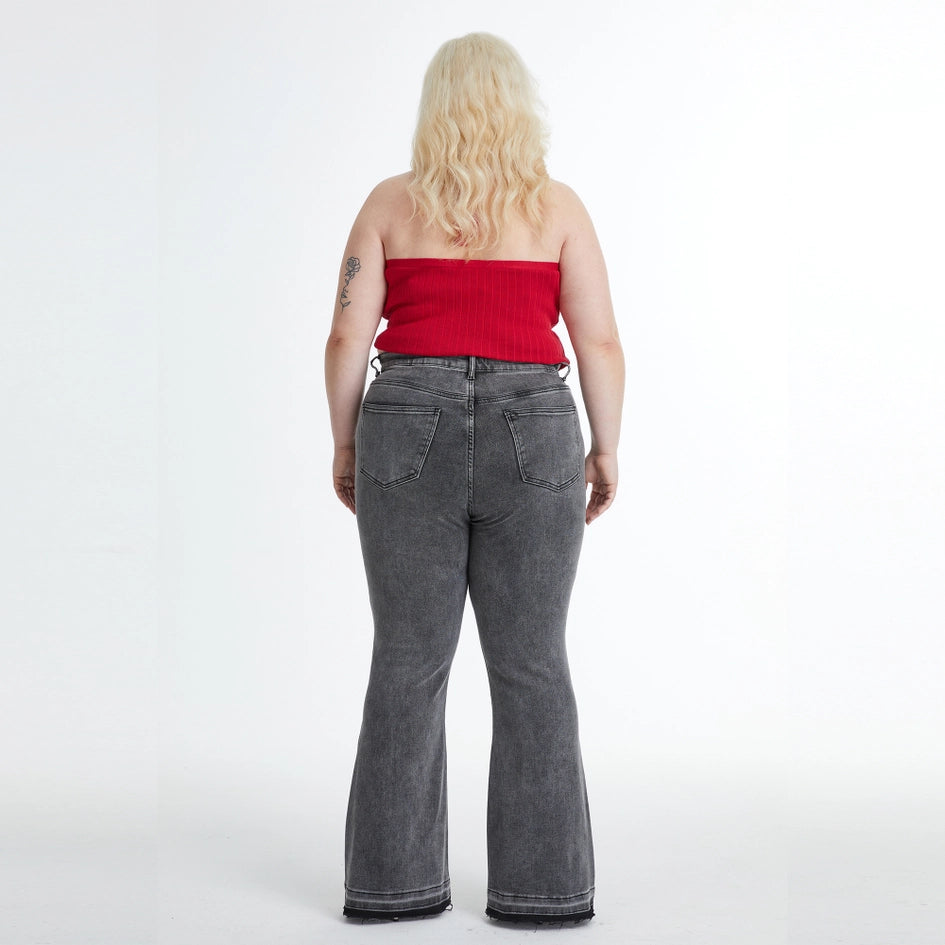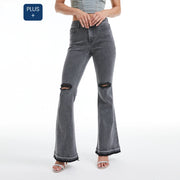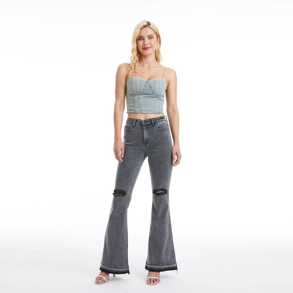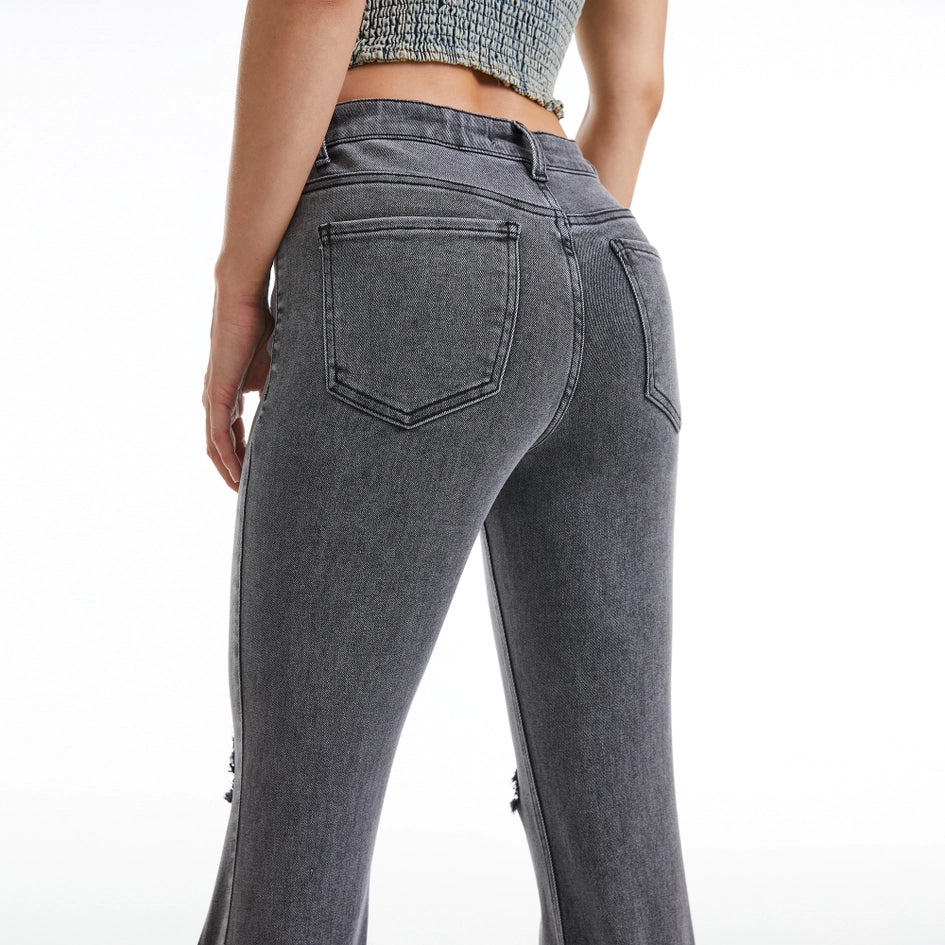 Expertly crafted from high-quality super stretch denim, these HEATHER GRAY Mid Rise Flare Jeans offer both style and comfort. The distressed hole design, natural washing effect, and raw hem add a touch of edginess, while the five pockets and mid rise waist provide practicality. Perfect for pre-fall and beyond.