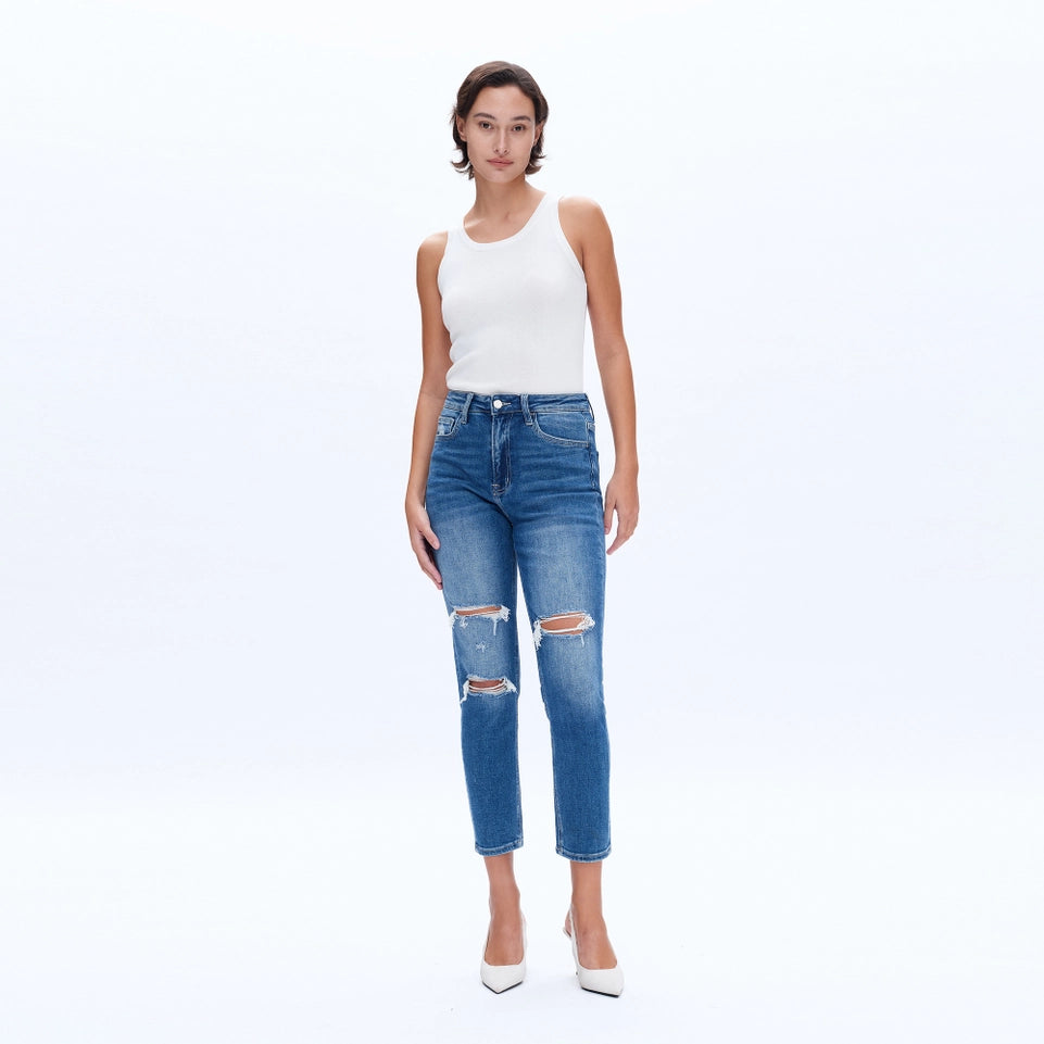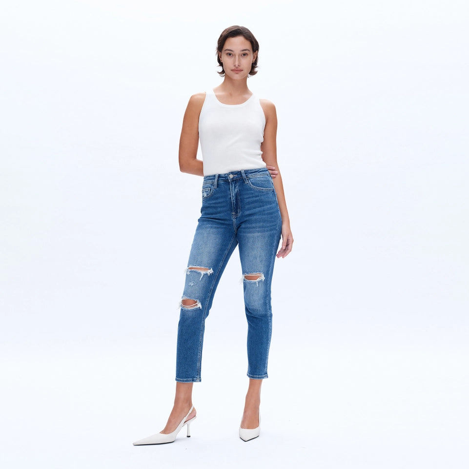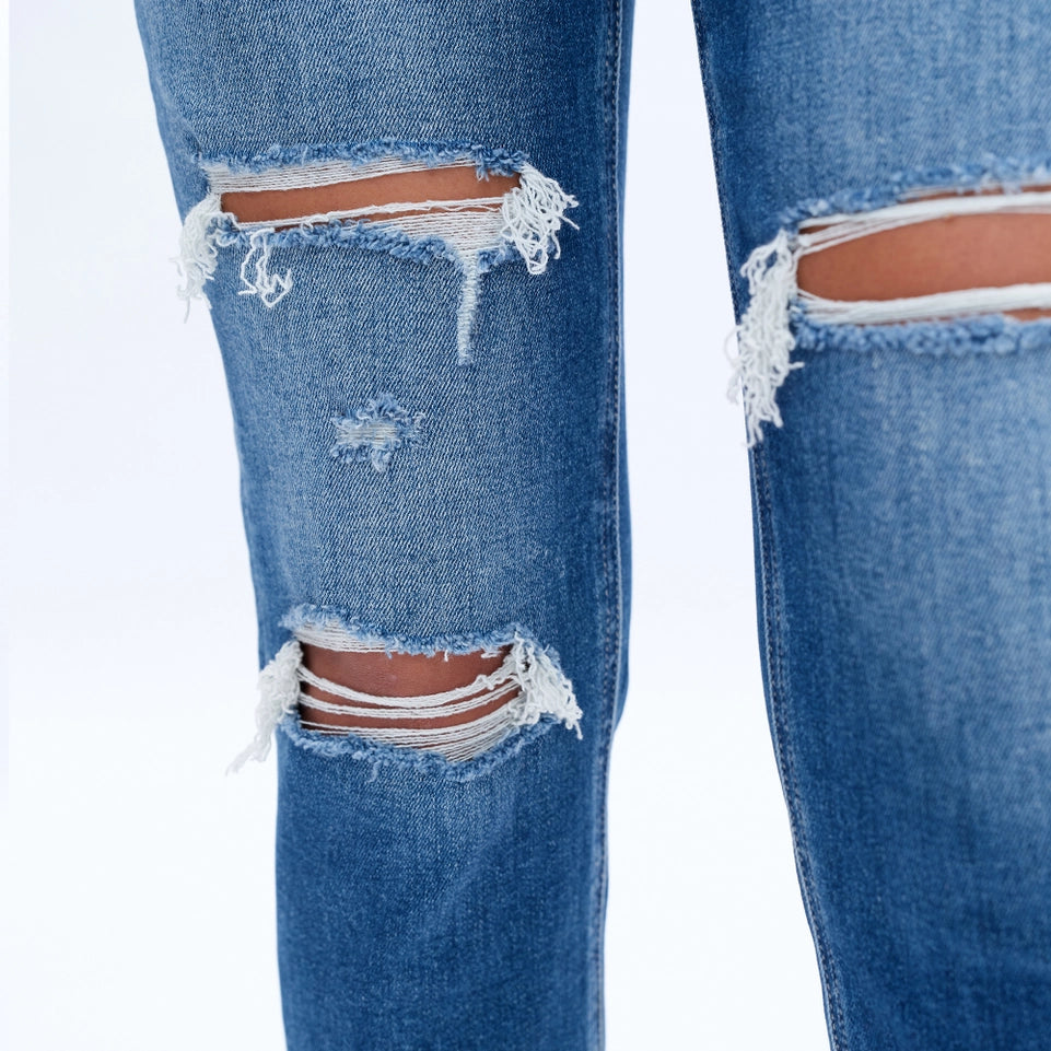 Upgrade your denim game with our Mid Rise Mom Jeans, made from super stretch denim for ultimate comfort and flexibility. With a dark blue wash, distressed hole design, and natural washing and whisker effects, these jeans bring a touch of edge. Finished off with a mid rise waist, five pockets, and a zipper fly. Care instructions: Machine wash.