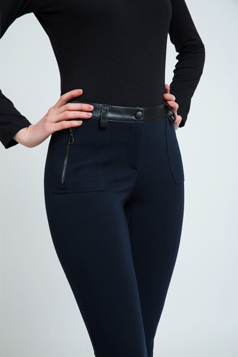 Long jeggings in stretch Punto di Roma fabric. Pleather at the waistband and belt loops. 2 small external pockets in the front which fasten with a thick metal zip. Fastens in the front with a zip and pleather button. Mid rise. Length: 96cm. Conquista long mid rise pleather detail jeggings.