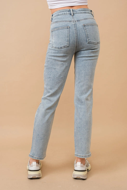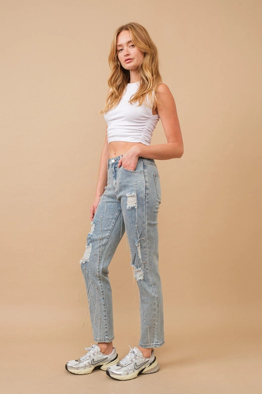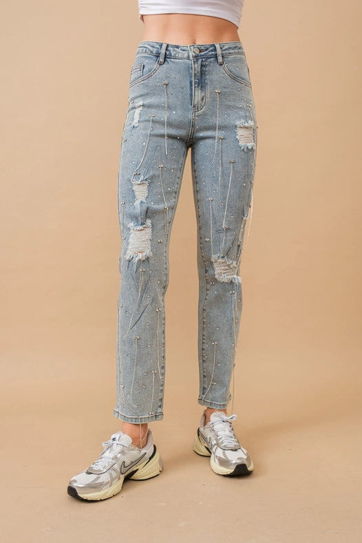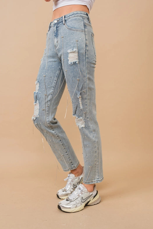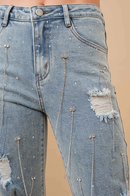 Mid Rise Rhinestone Fringe Denim Jeans Light Wash