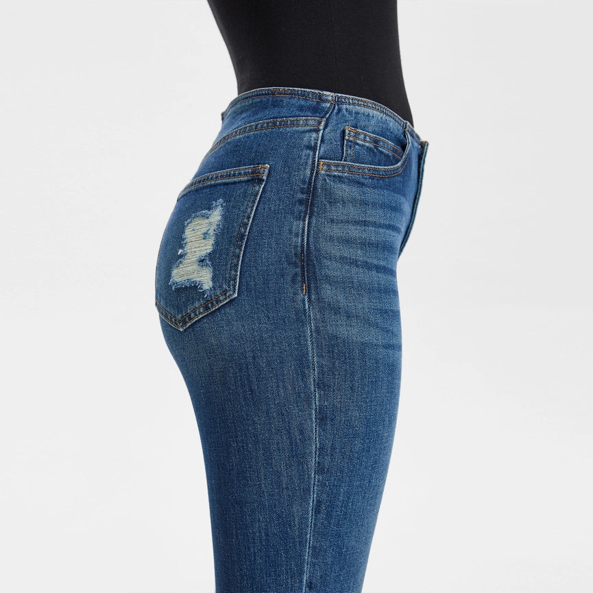 Expertly crafted from a minor stretch denim, these Mid Rise Waistless Bootcut Jeans with Finished Hem offer a comfortable fit that moves with you. The navy hue, distressed hole design, and natural washing effect add a touch of edge, while the whisker effect gives a lived-in look. Perfect for pre-fall, with a five pocket design, mid rise waist, and finished hem. Machine wash for easy care.