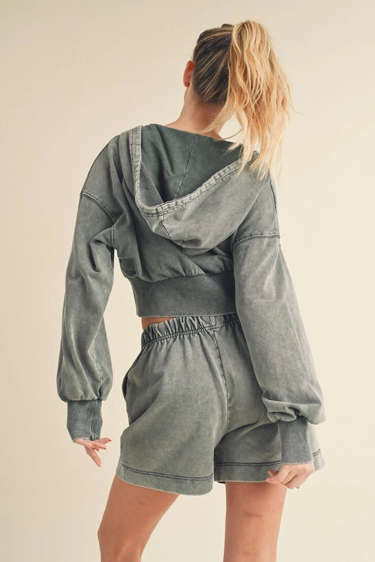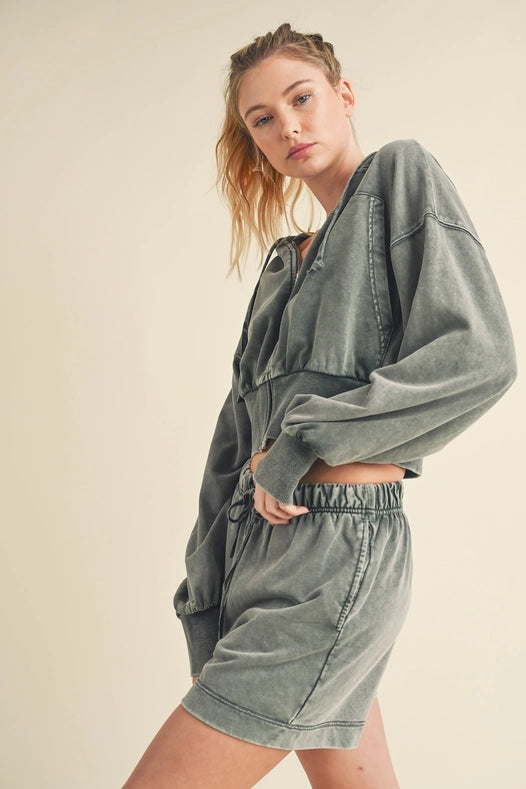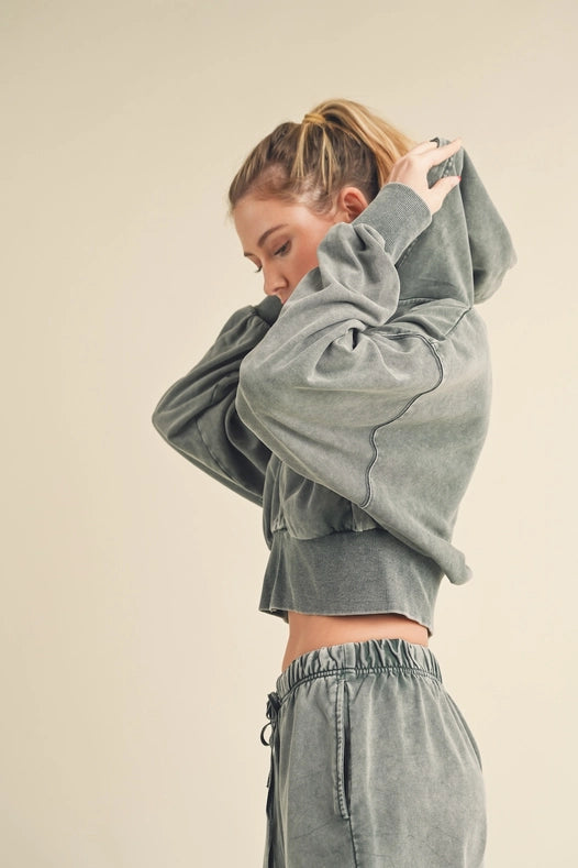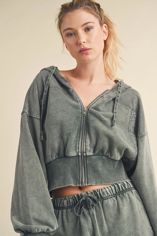 Expertly crafted with a dropped shoulder, boxy silhouette, and adjustable drawstrings, our Mineral Wash Zip-Up Hoodie offers a comfortable and versatile fit. Made of 83% cotton and 17% polyester, it provides the perfect balance of softness and durability. Ideal for lounging at home or wearing after a workout, this hoodie is a must-have for any wardrobe.