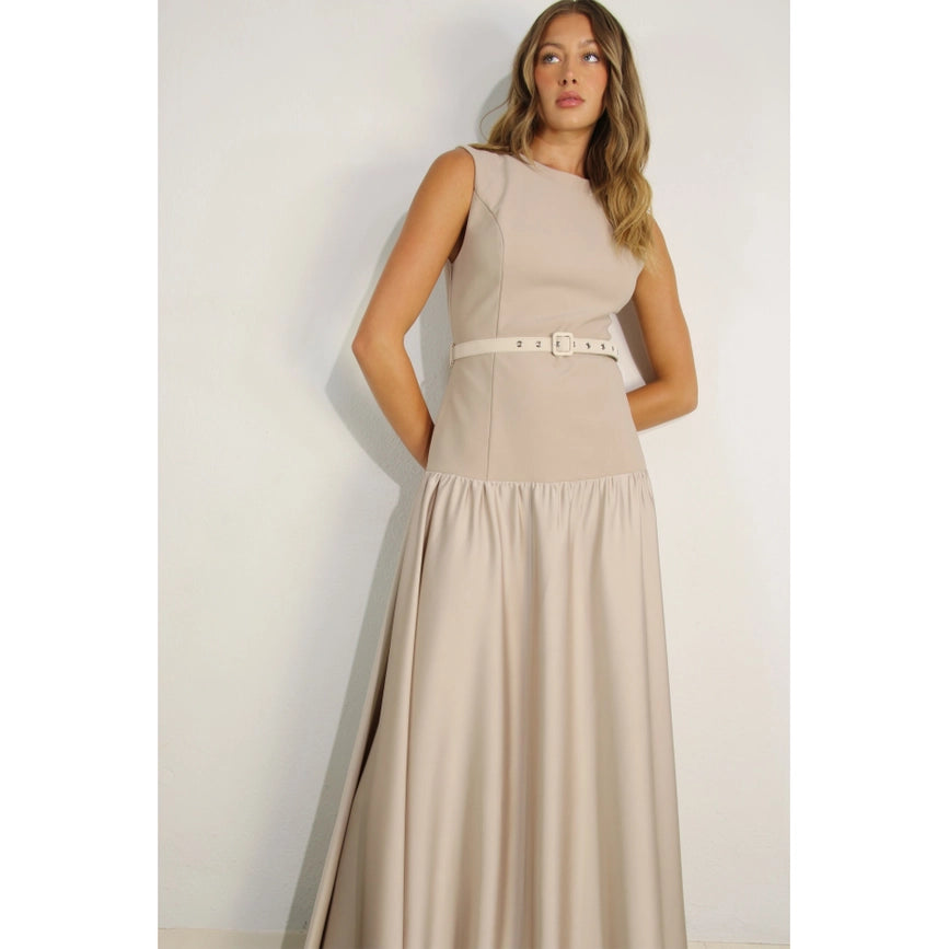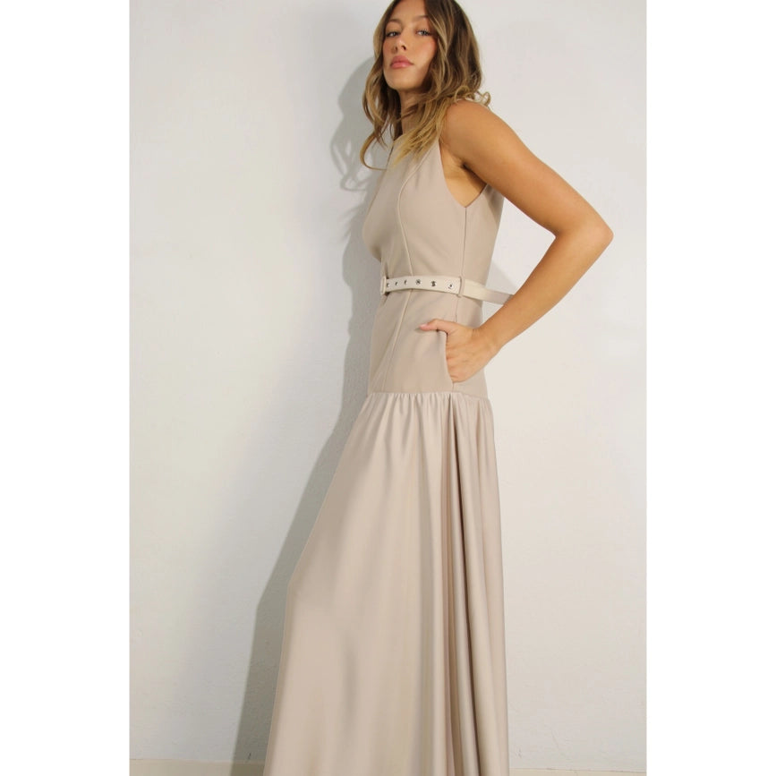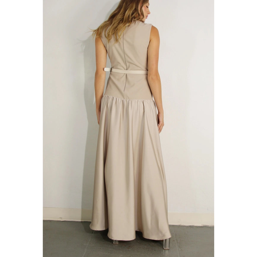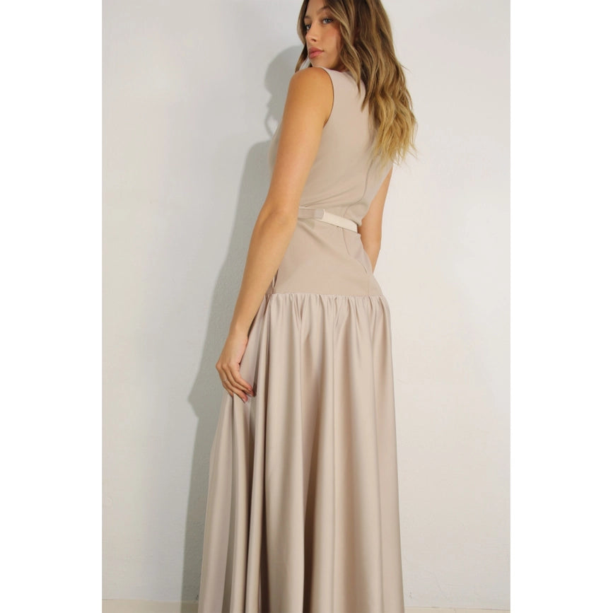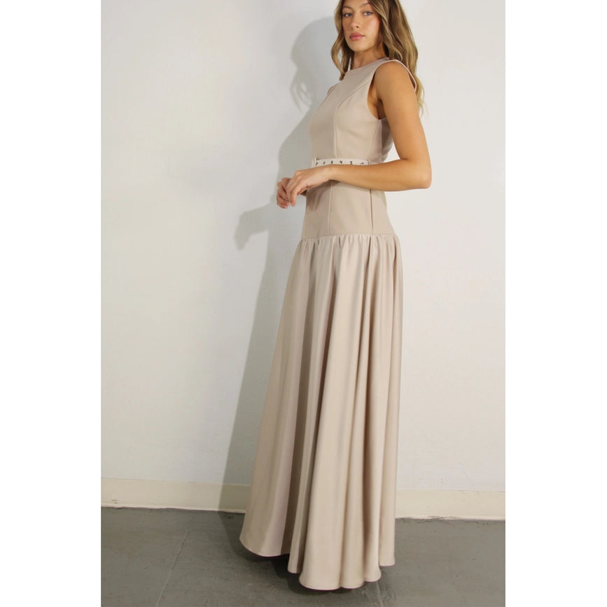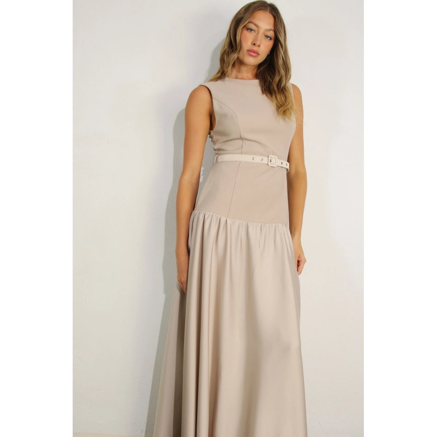 Mixed Fabric Belted Maxi Dress MAUVE BROWN
