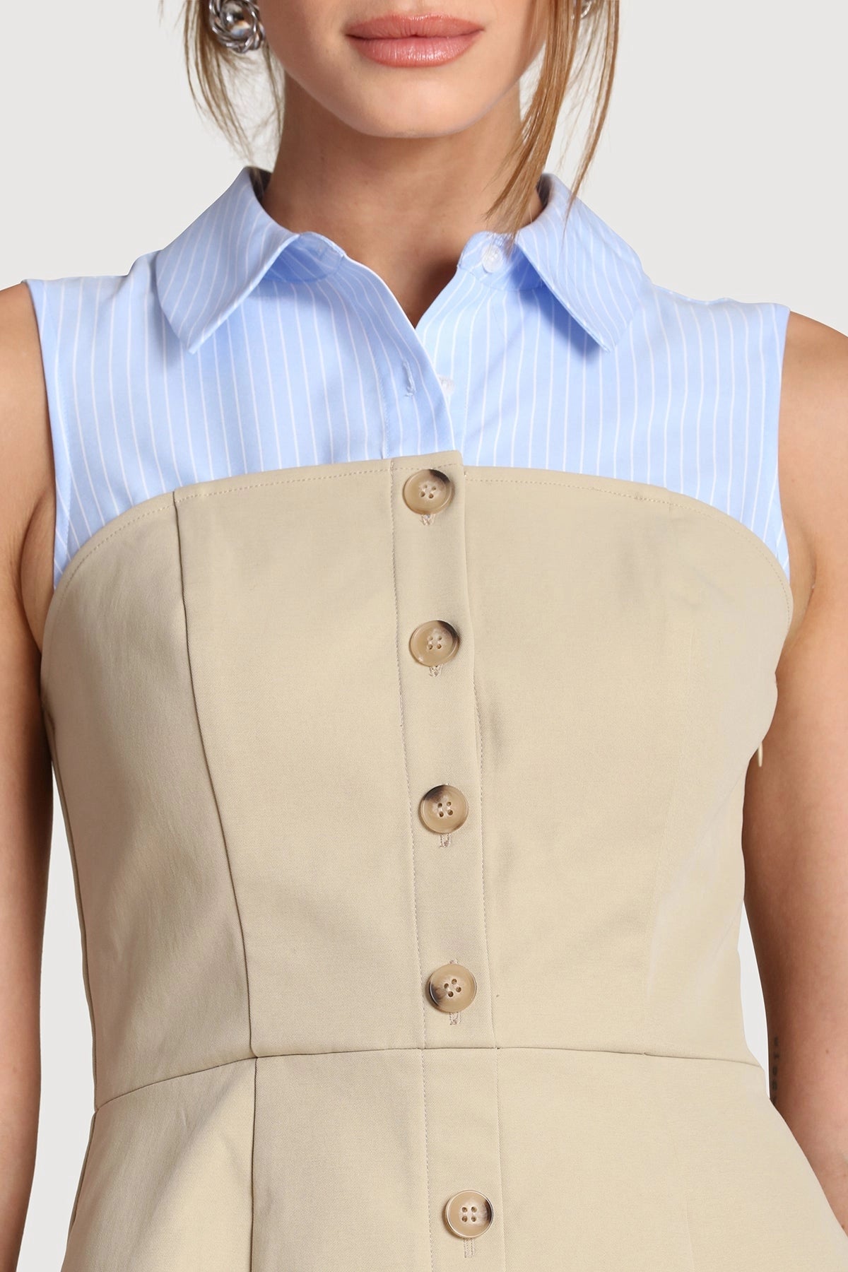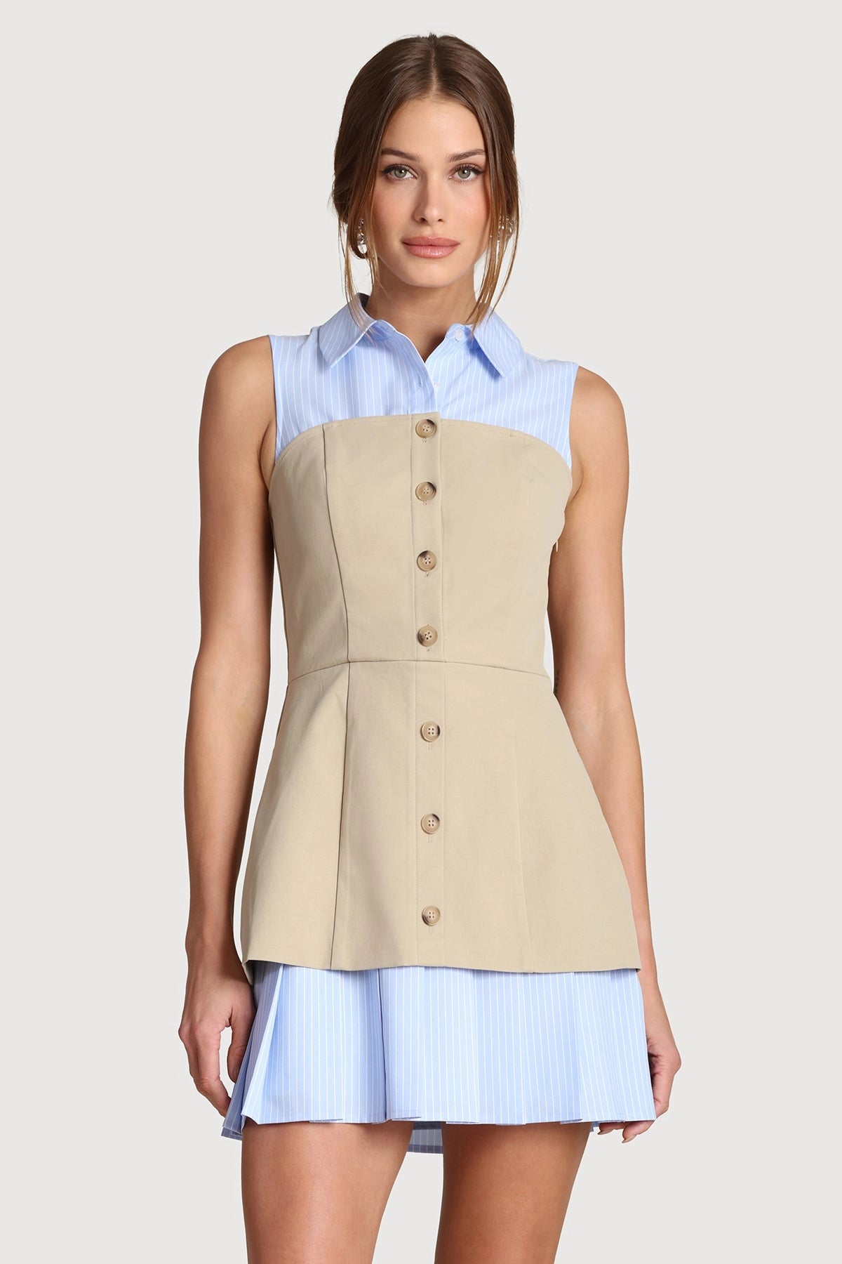 Combining tailored sophistication with contemporary flair, this mixed-media mini dress merges crisp blue pinstripes with a structured khaki foundation. The button-front closure and pleated skirt create refined movement, while the contrasting fabrics deliver an understated yet distinctive aesthetic. Perfect for transitional seasons and urban exploration, it balances polished elegance with modern ease.
