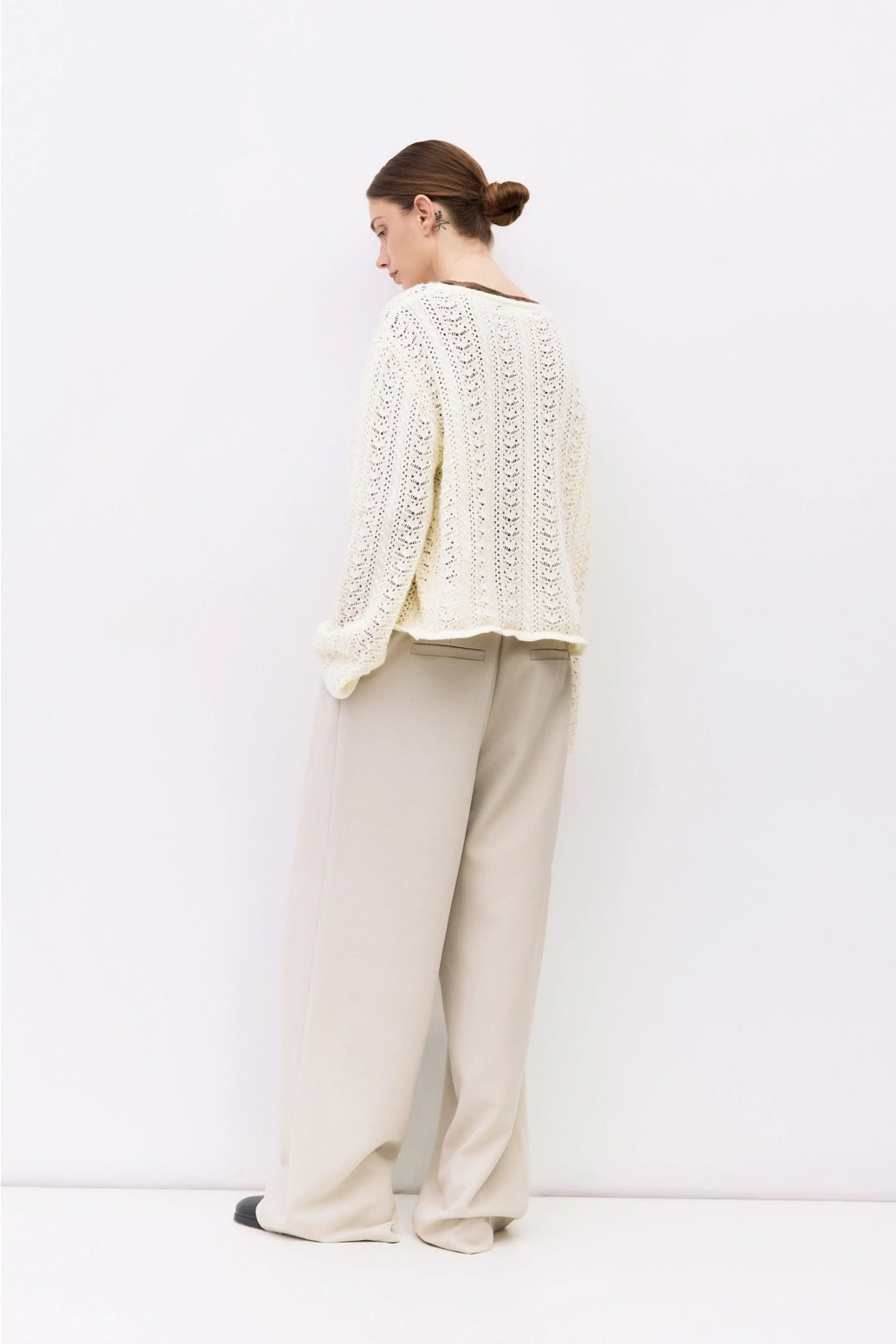 The Avia Cardigan is made from a delicate, lightweight pointelle knit, offering a soft, open-weave texture. It includes a crewneck, long sleeves, and a tie-front design, all tailored in a relaxed silhouette. Perfect for layering during seasonal transitions.