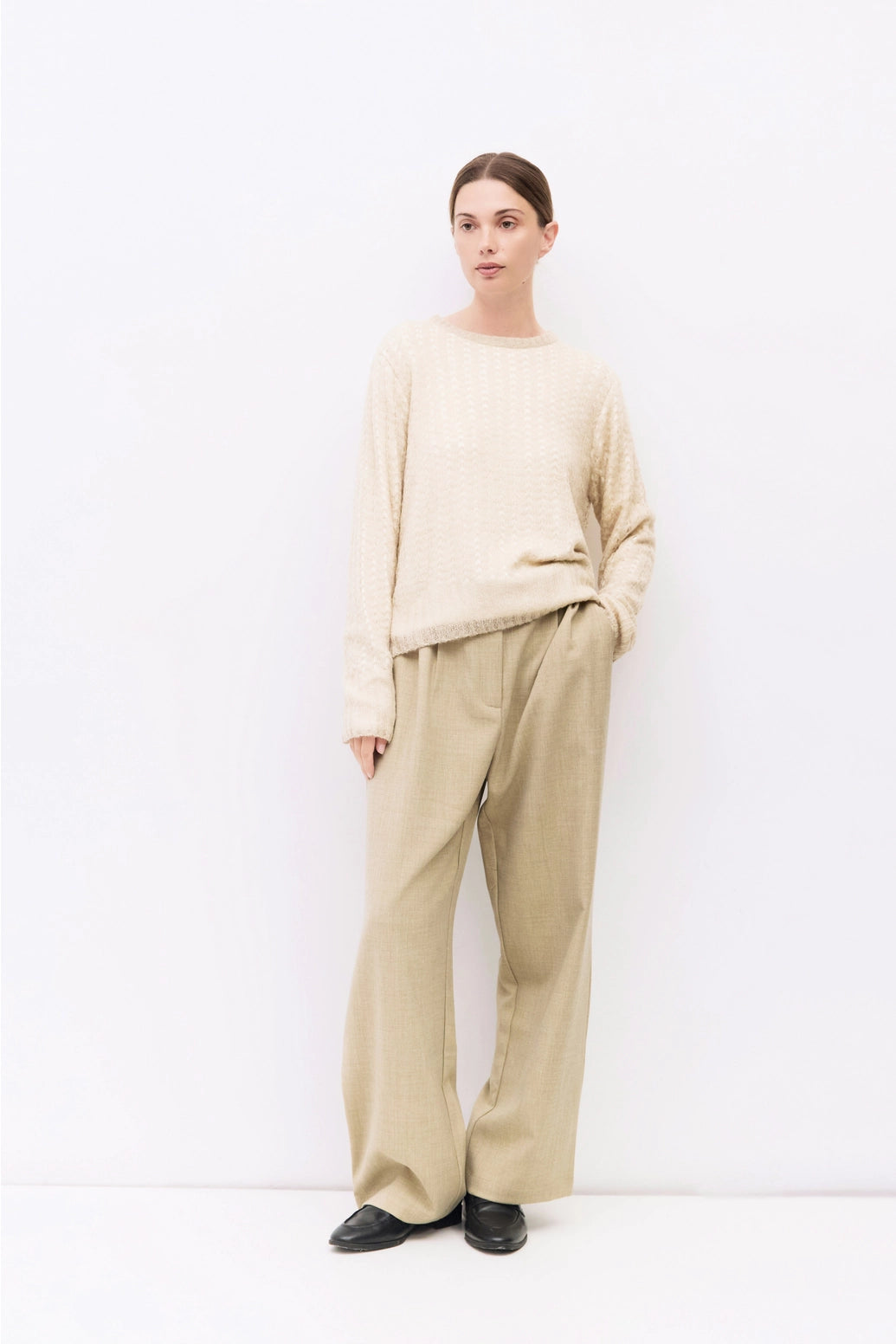 The Miriam Sweater is crafted from a delicate pointelle knit with a soft inner lining, offering gentle texture alongside comfort. Designed with a relaxed silhouette, crew neckline, and long sleeves, it serves as a versatile layering option throughout the seasons.