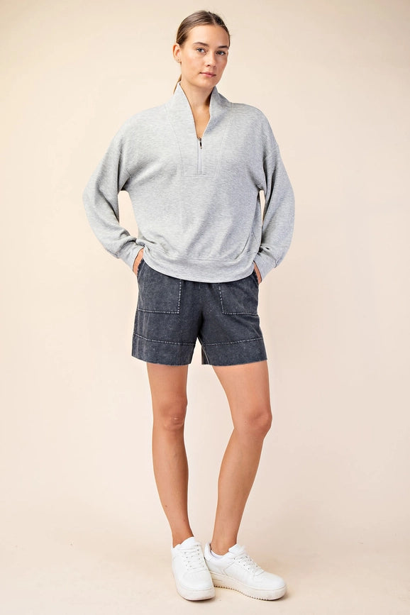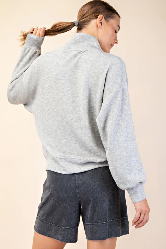 Crafted from a silky smooth Modal Poly Span Scuba fabric, this lightweight jacket offers a luxurious feel. The oversized, relaxed fit, quarter zip closure, and V-neck design create a laid-back yet trendy look. With dropped shoulders and bubbled sleeves, comfort is combined with fashion in this stylish piece.