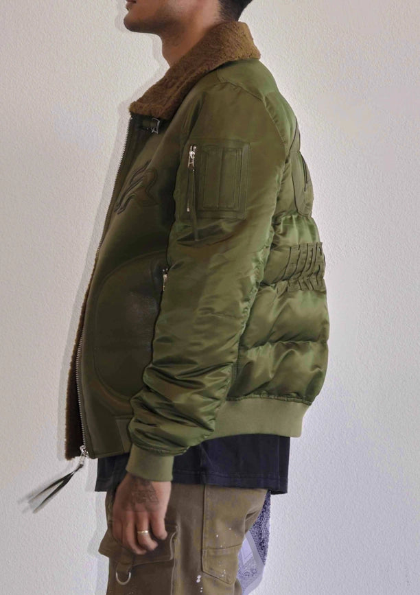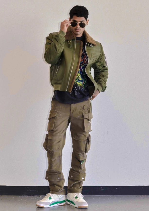 Stay warm and stylish in the Mustang MA-1 Jacket. This utility oversized bomber features a faux fur collar, rib-knit banding for a comfortable fit, and warm quilting inside lining. With a center front zipper closure, this jacket is perfect for any cold weather occasion.