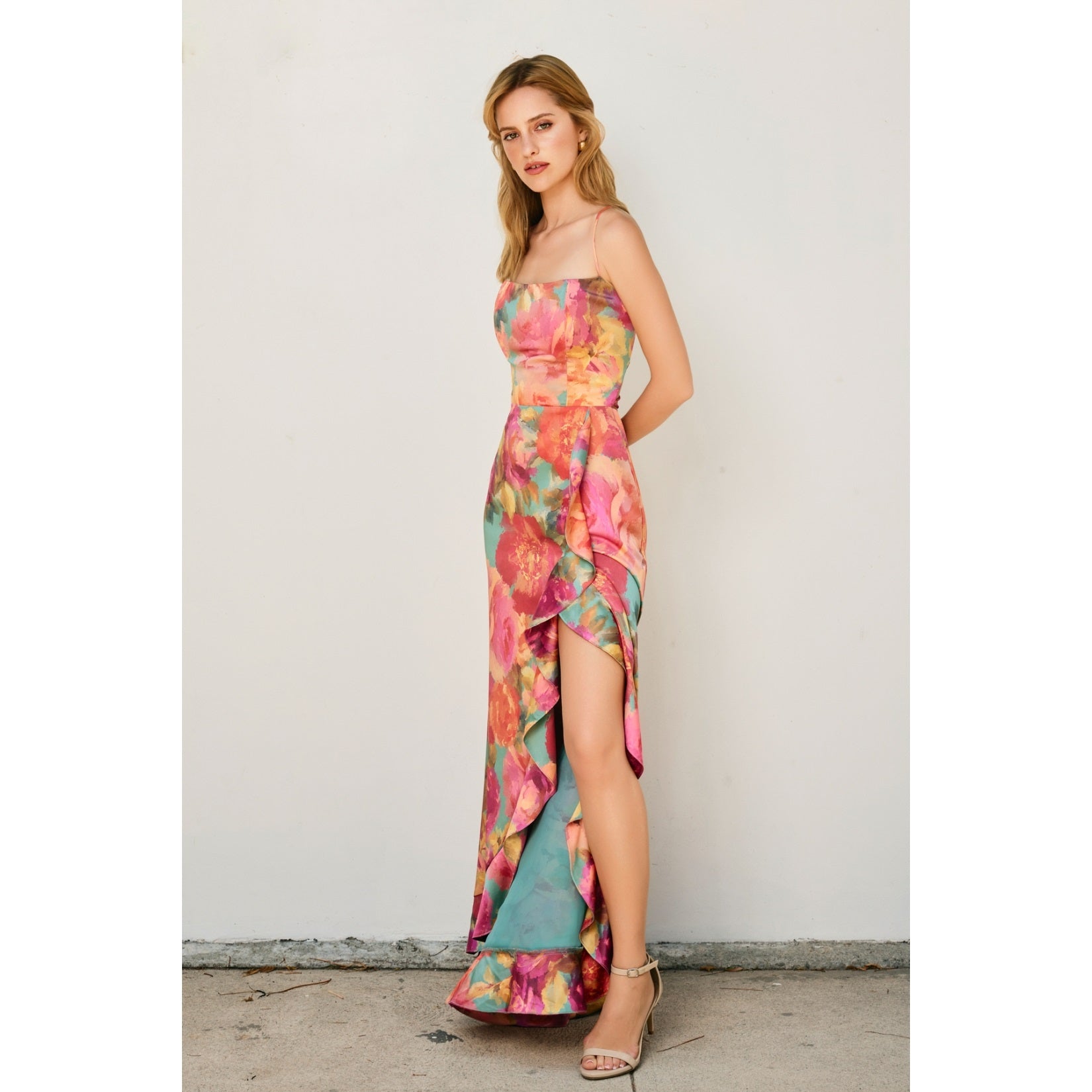 This floral satin maxi dress features a structured corset bodice with subtle padding and a straight neckline. It showcases a ruffled surplice skirt with a slit and an open back secured by an adjustable crisscross tie. The dress includes a concealed back zipper and a lined interior for comfort. The model is 5'6" wearing size Small. Shell and lining are both crafted from 100% polyester.