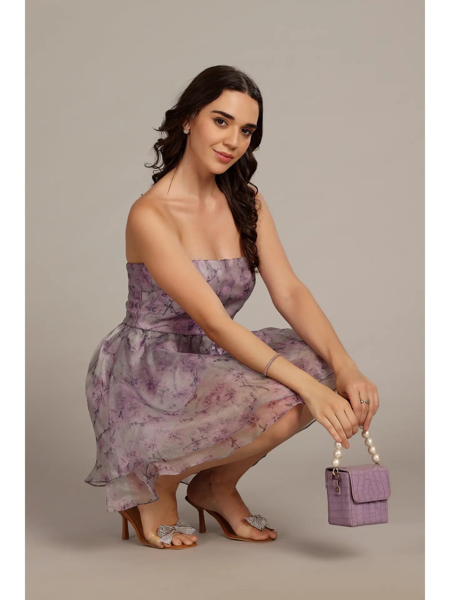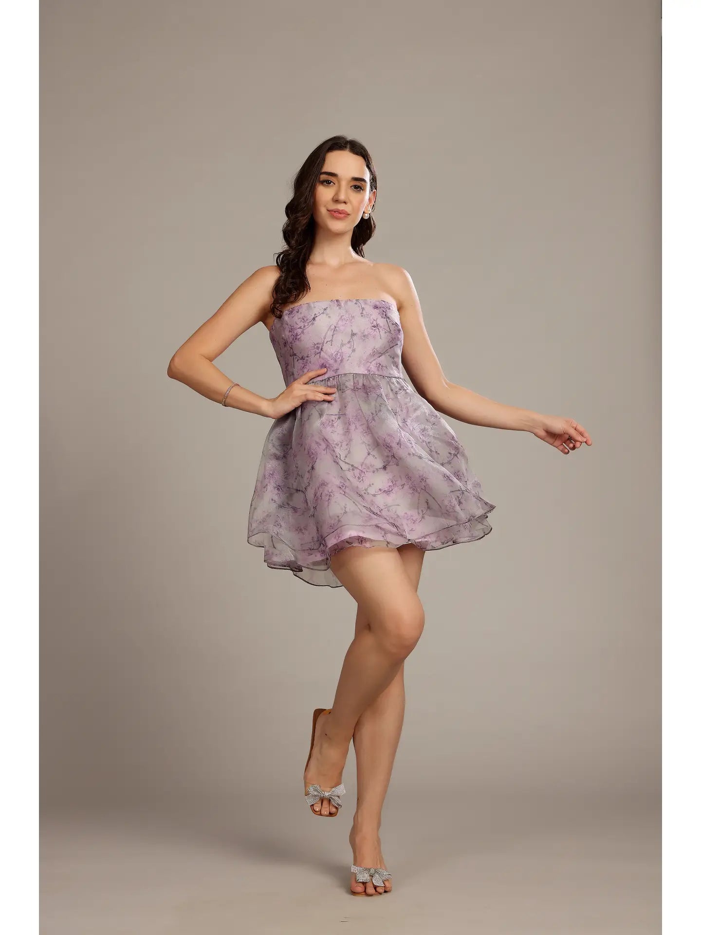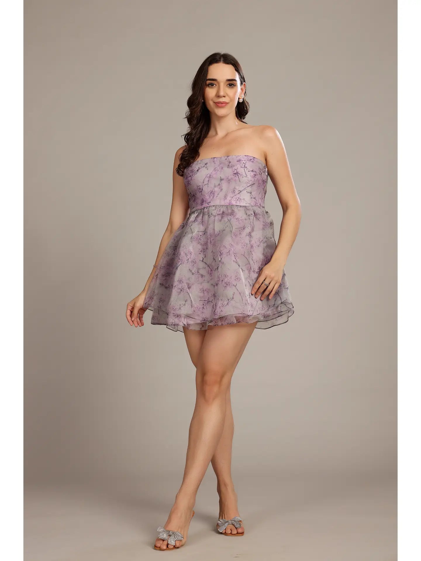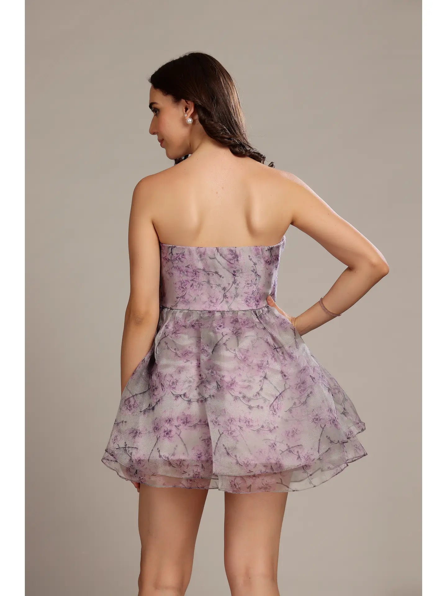 The Nora Mini Dress in Lavender Lilac Floral features a delicate lilac floral print on sheer organza, offering a soft, feminine appeal. Its structured bodice cinches the waist, flowing into a voluminous layered skirt that creates an elegant silhouette. Ideal for spring and summer events, this strapless dress is perfect for weddings, garden parties, or any special occasion where refined romance is desired. Pair with strappy heels and minimal accessories for a sophisticated, polished look.