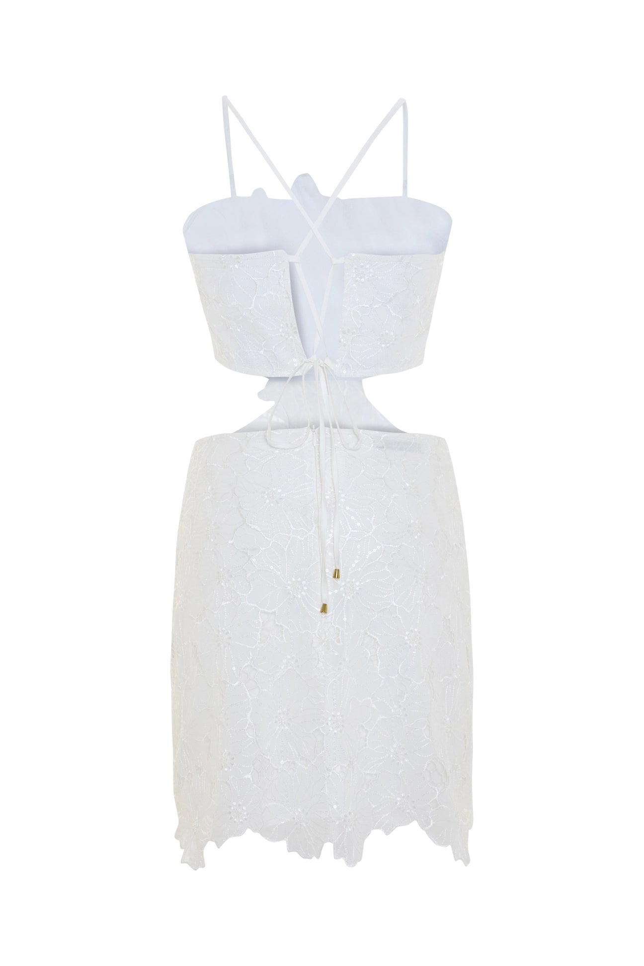 The Nysa Dress merges refined craftsmanship with contemporary allure. This mini silhouette showcases embroidered tulle adorned with delicate floral patterns and shimmering sequin accents that dance with movement. A stunning hand-beaded applique blooms across the front bodice, delivering couture-inspired sophistication. Spaghetti straps frame a bandeau bust while a sculpted cut-out waist defines the figure with modern elegance. The lace-up back, finished with gold-tipped ties, offers both adjustability and refined detail. Scalloped hemming and complete lining complete this polished design—an exquisite selection for weddings, formal evenings, or upscale celebrations.