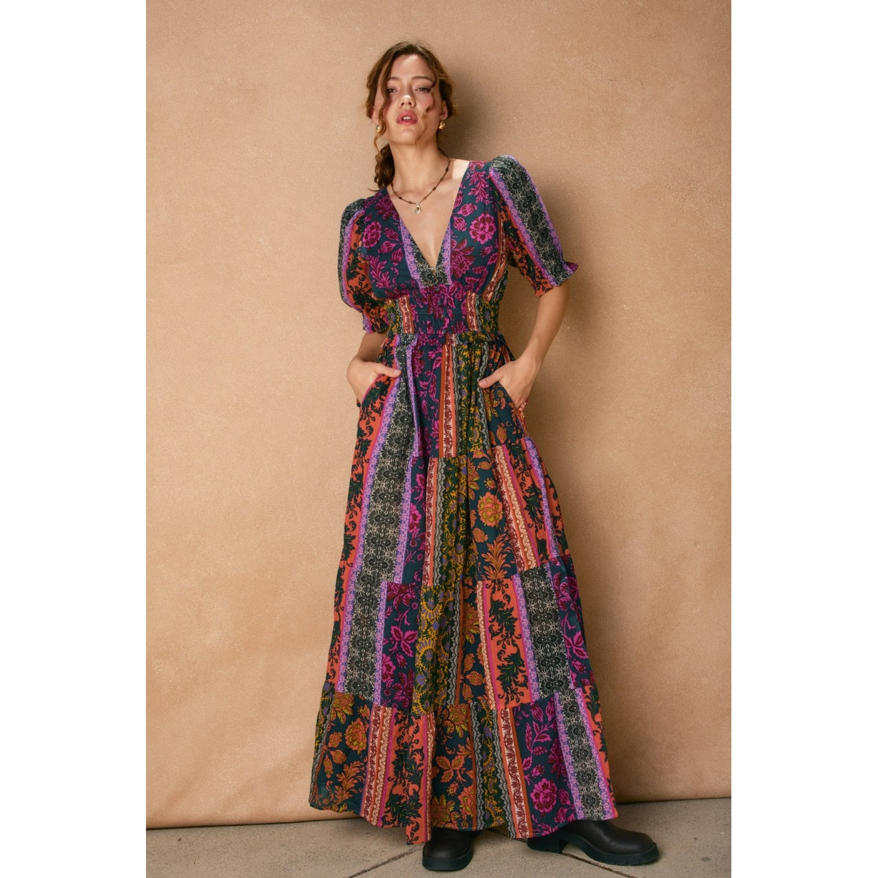 This paisley print maxi dress features a plunging neckline and a cinched waist accented with button details. Designed with puff sleeves ending in ruffled elastic cuffs and a tiered skirt with a slit, it offers both style and comfort. Equipped with side pockets and fully lined, this dress is crafted from 100% cotton for a refined look. The model is 5'6" and wears a size Small.