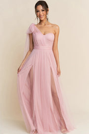 One Shoulder Tulle Tied Double Slits Details Maxi Dress Pink