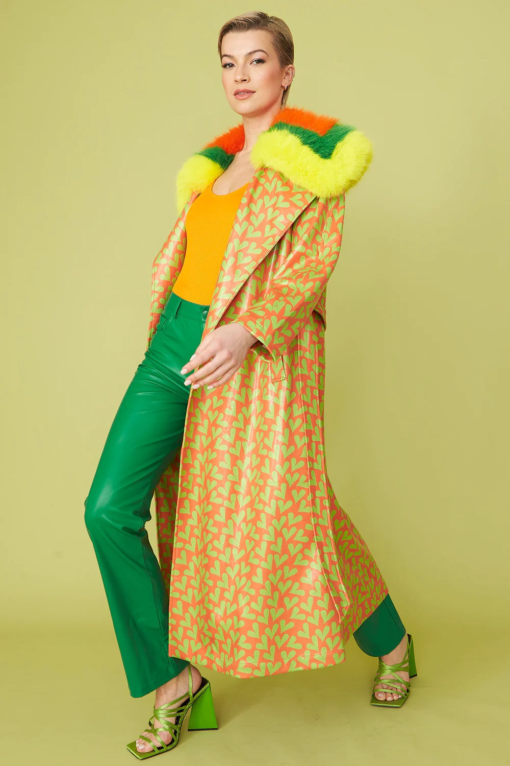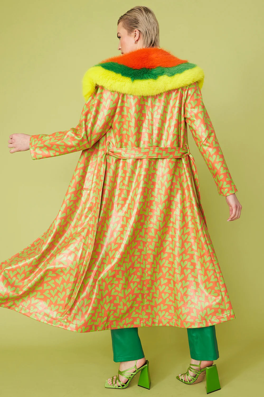 Cozy up in this Orange Tencel Blend Eco Leather Trench Coat with a little bit of lovin’—it's got cute heart prints and a luxuriously soft faux suede feel! The pockets and belt fastening add a touch of practicality. Take a walk on the wild side and look fab & warm!